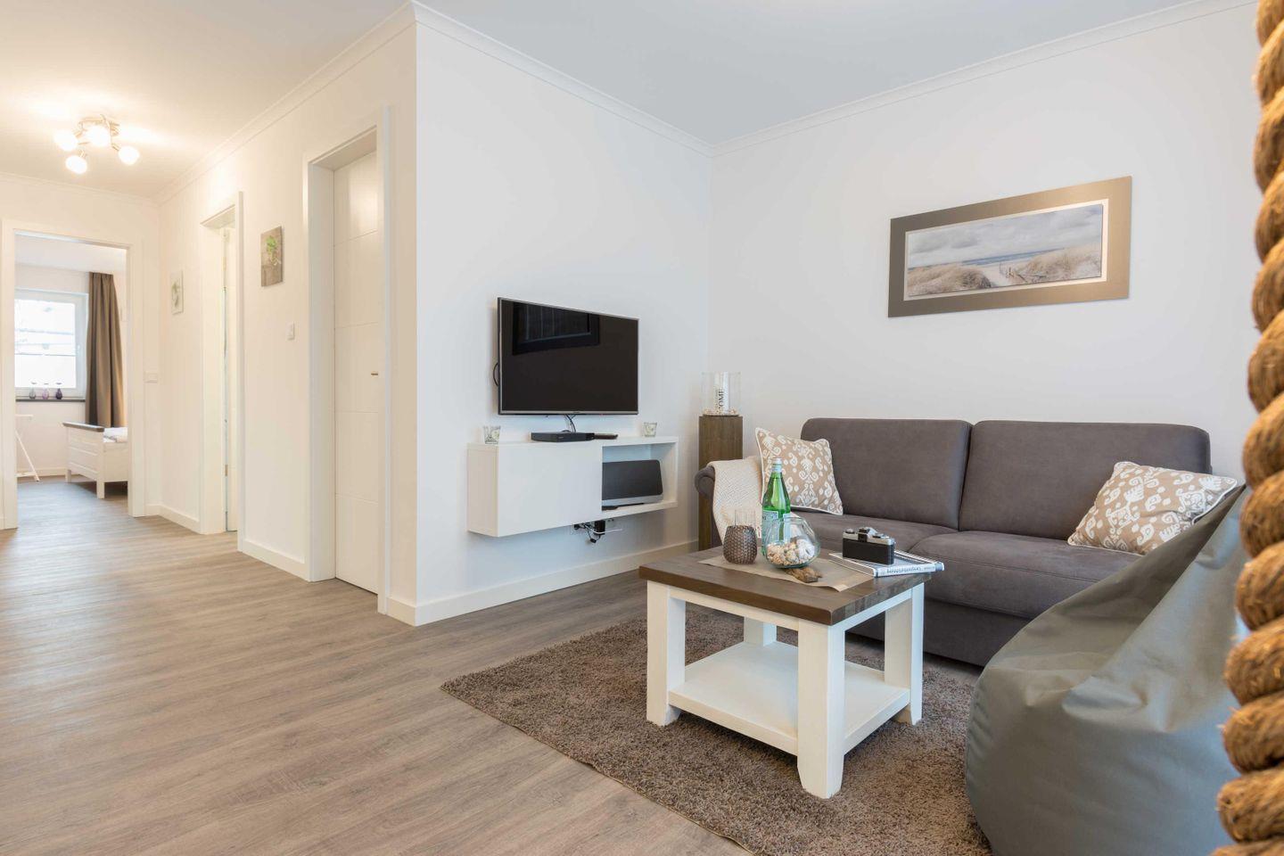 Die liebevoll eingerichtete 3-Zimmer-Ferienwohnung bietet genug Platz für bis zu vier Personen. Vom Wohnraum aus haben Sie Zugang zur Terrasse mit Tisch und vier Stühlen. Von hier aus können Sie den Blick in Richtung Deich genießen und den Tag beginnen und auch enden lassen. Der Wohnbereich wirkt hell und gemütlich. Das Sofa mit Schlaffunktion (Liegefläche 150x200 cm) wird ergänzt durch einen Sitzsack, einen Flat-TV, einen Blu-ray-Player sowie eine kleine Musikanlage.