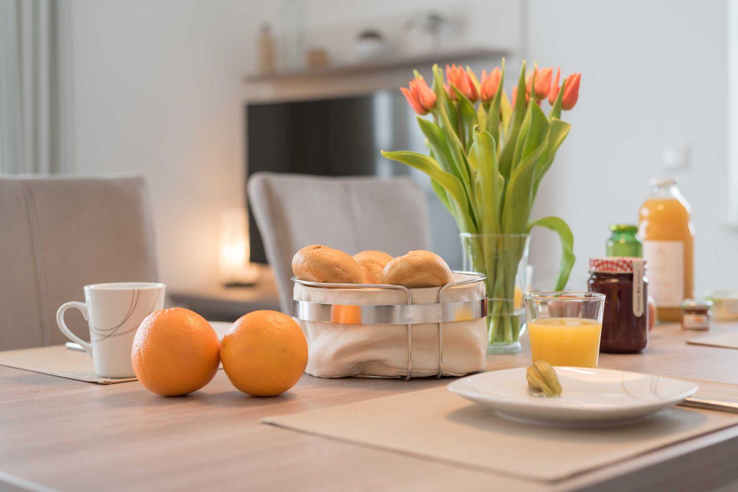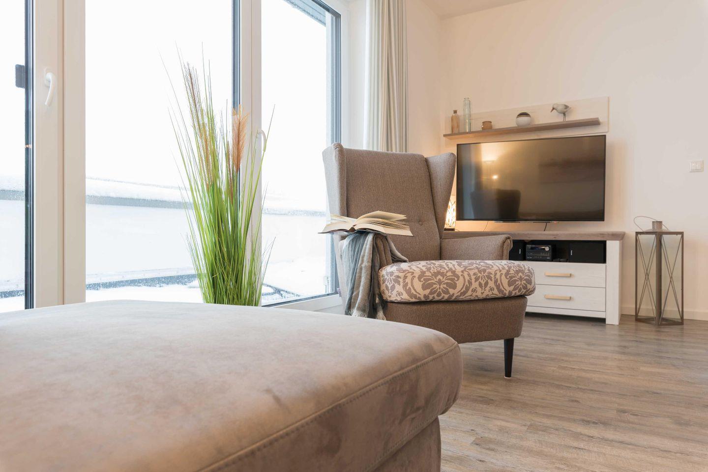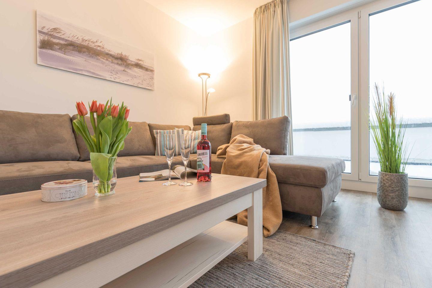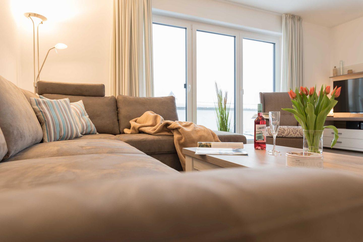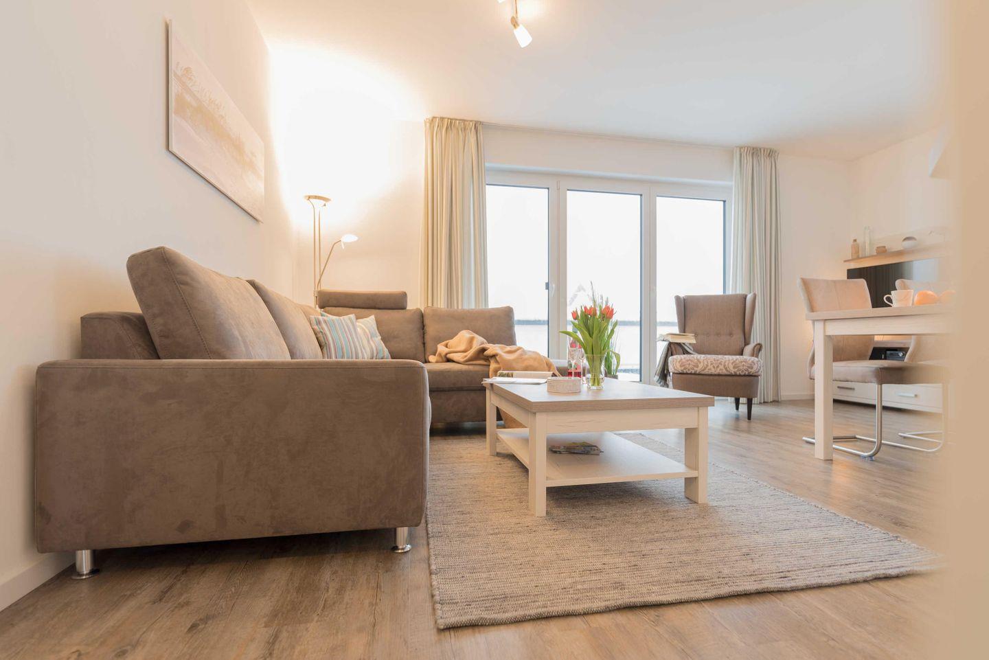 Im hellen und geschmackvoll eingerichteten Wohnzimmer laden eine gemütliche