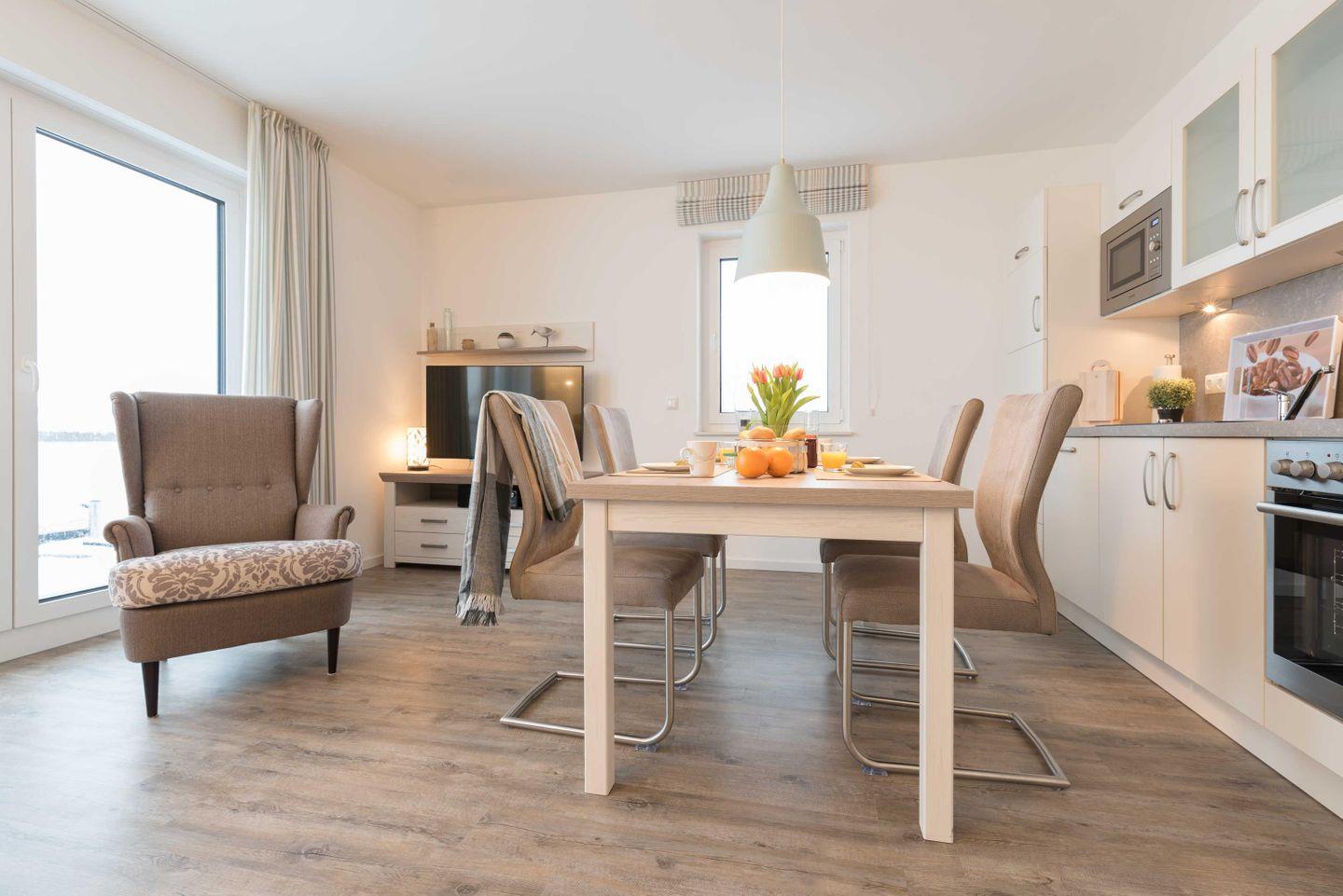 Couch mit passendem Sessel sowie ein großer Esstisch zum Verweilen ein. Die