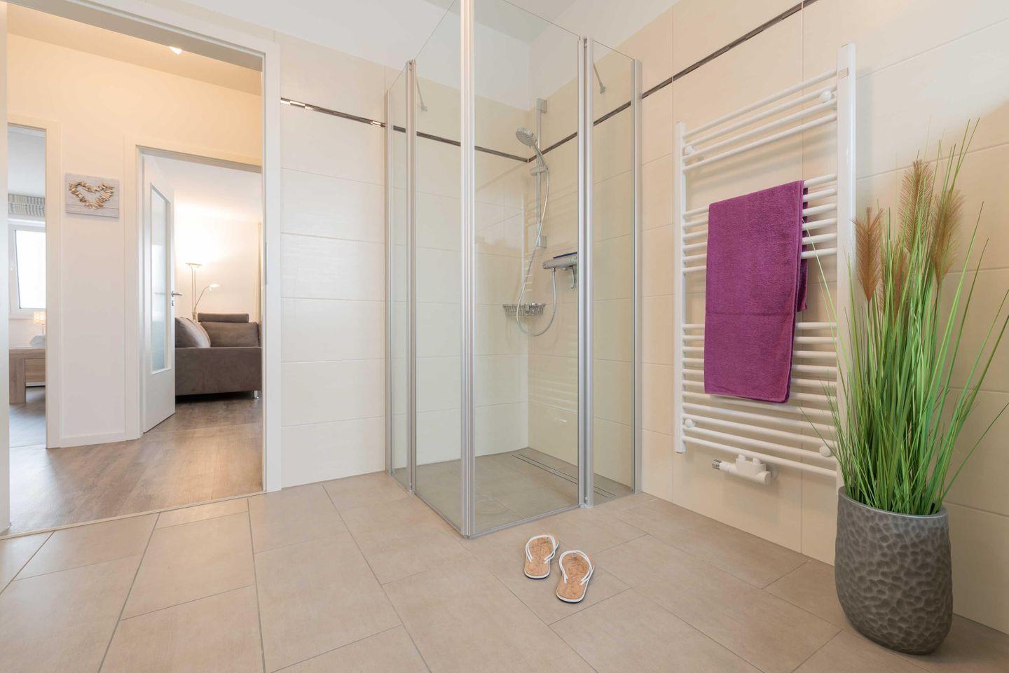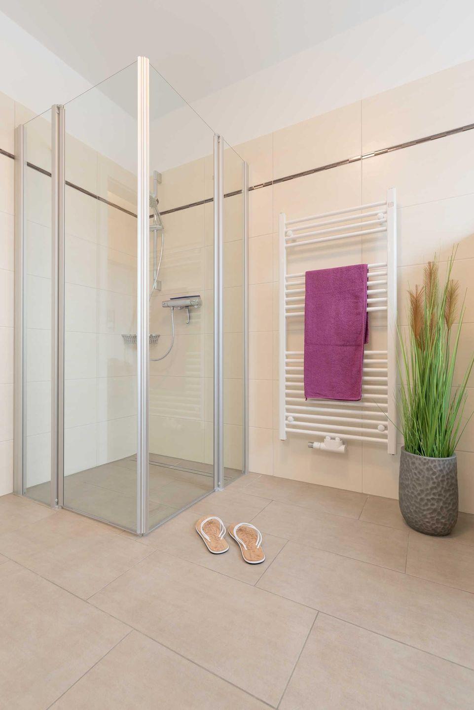 Bad mit ebenerdiger Dusche und ein kleiner Abstellraum. Auf dem Grundstück
