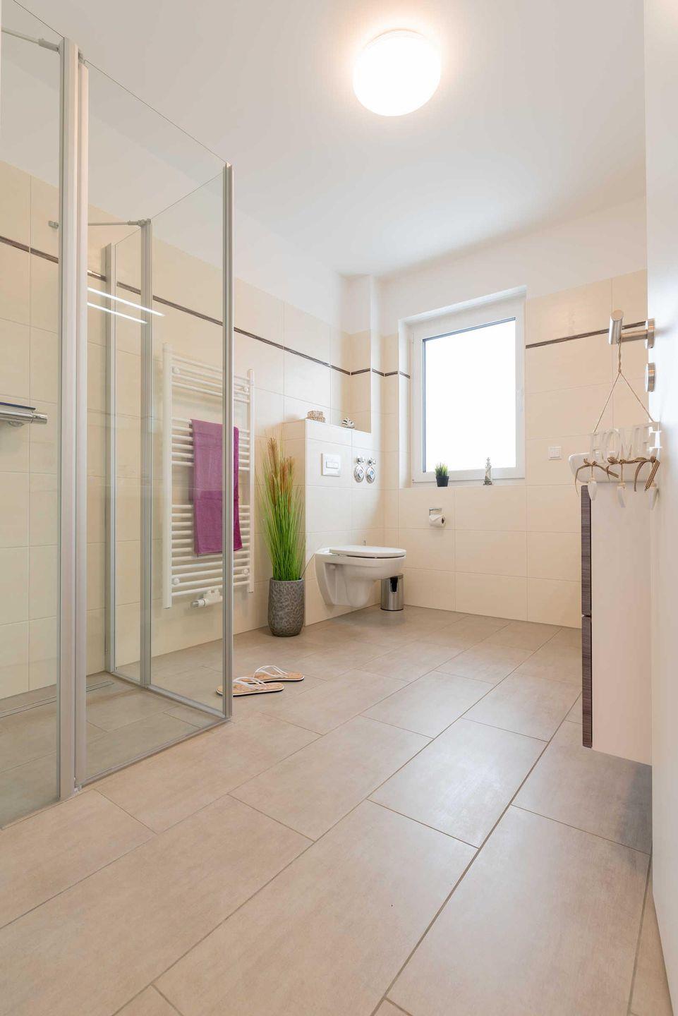 Das helle Badezimmer mit Fenster und bodengleicher Dusche besticht mit einem