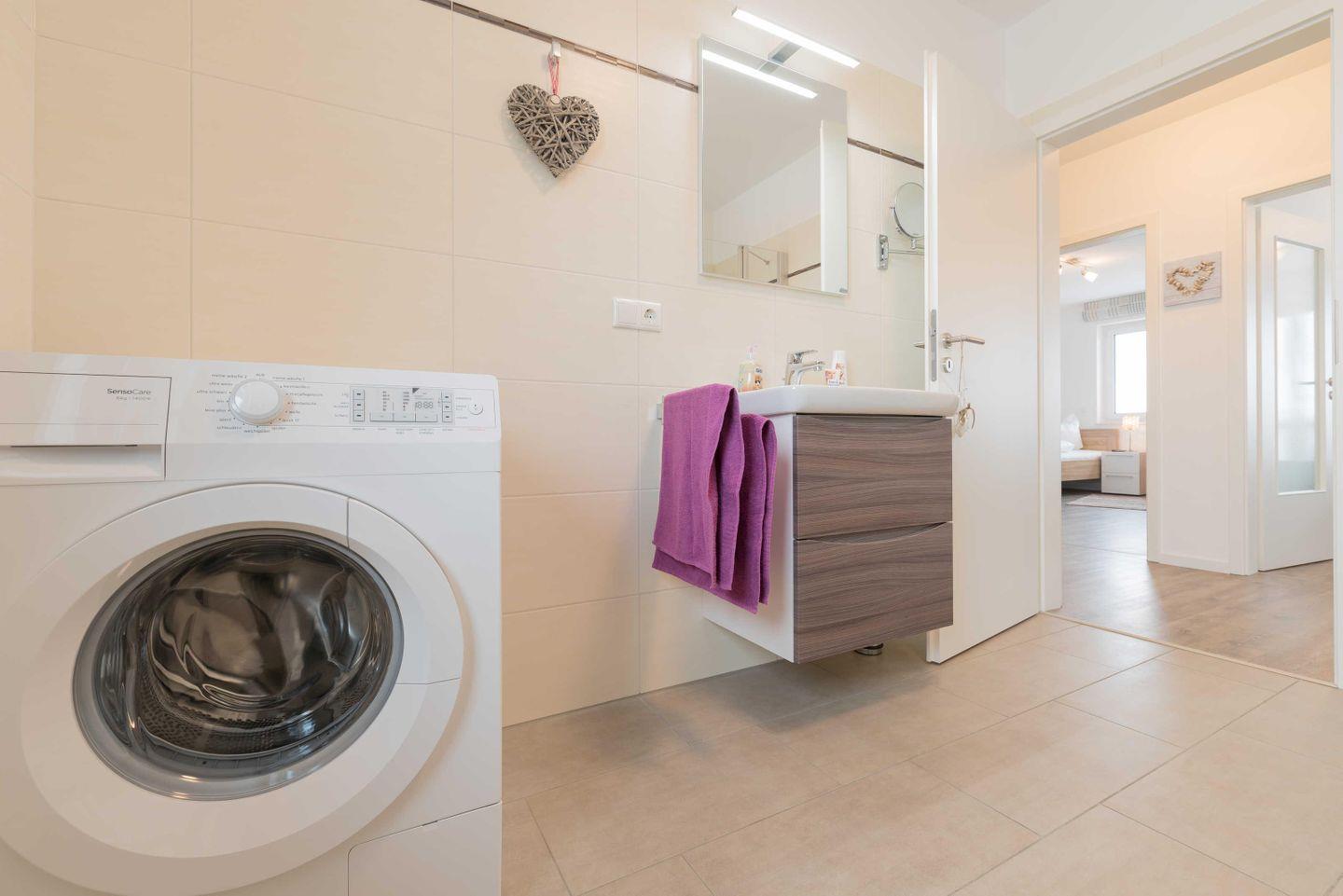 Haartrockner und einem Handtuchheizkörper. Eine Waschmaschine steht ebenso zur