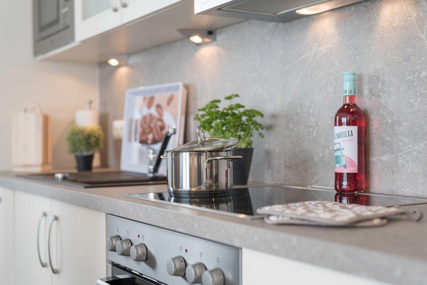 Kühl- und Gefrierschrank, einen Backofen, ein Cerankochfeld, eine Mikrowelle,