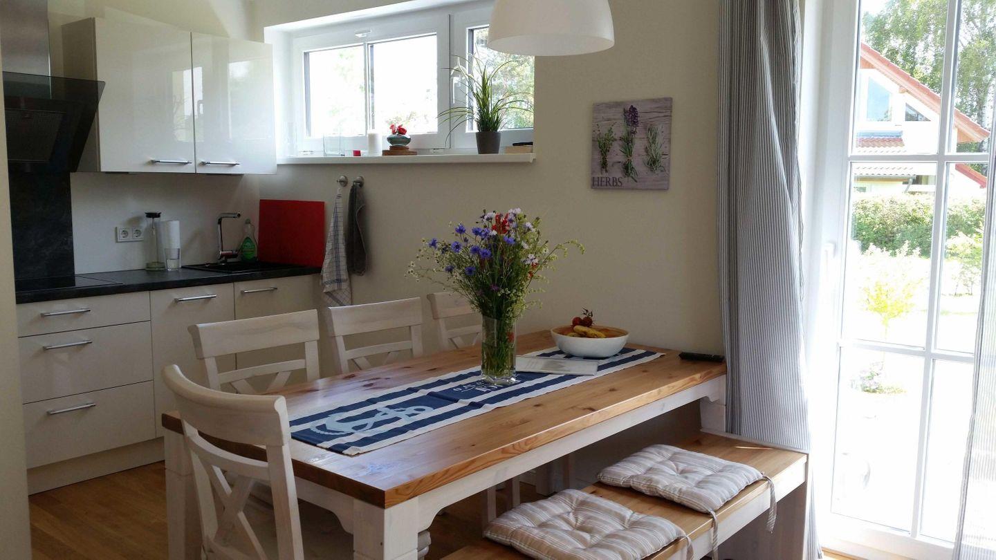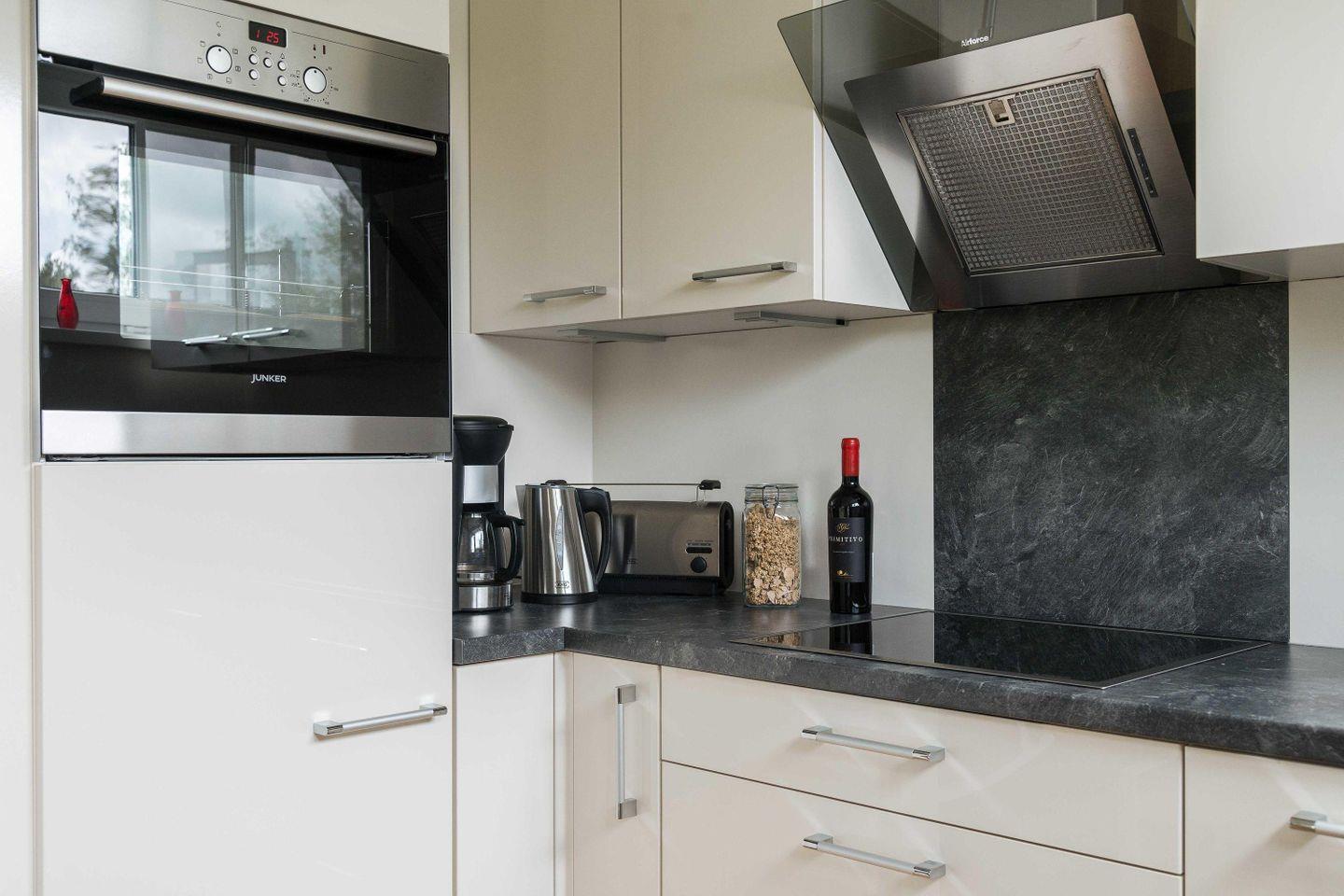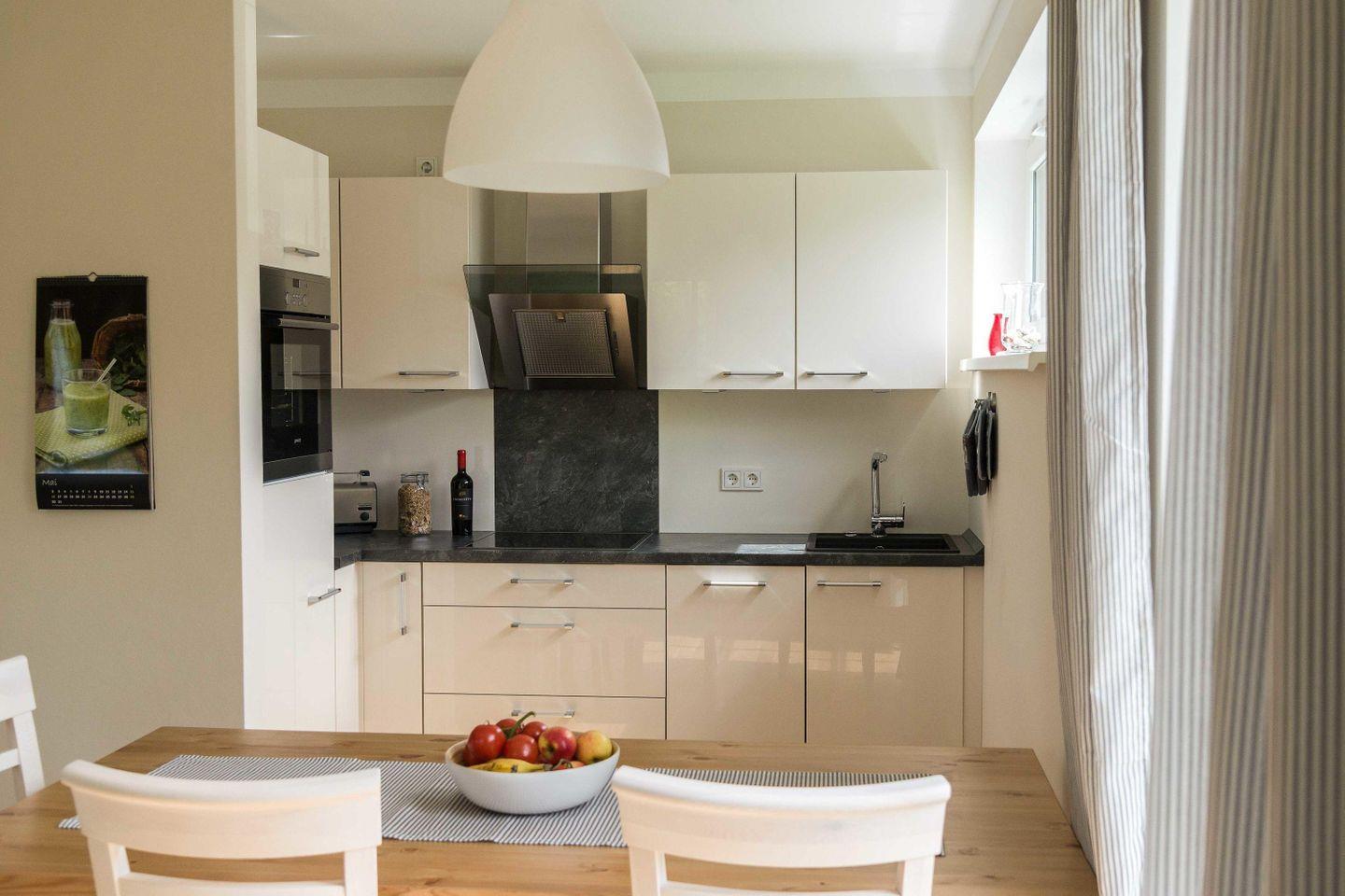 offenen, modernen Einbauküche an, welche mit allen notwendigen Geräten