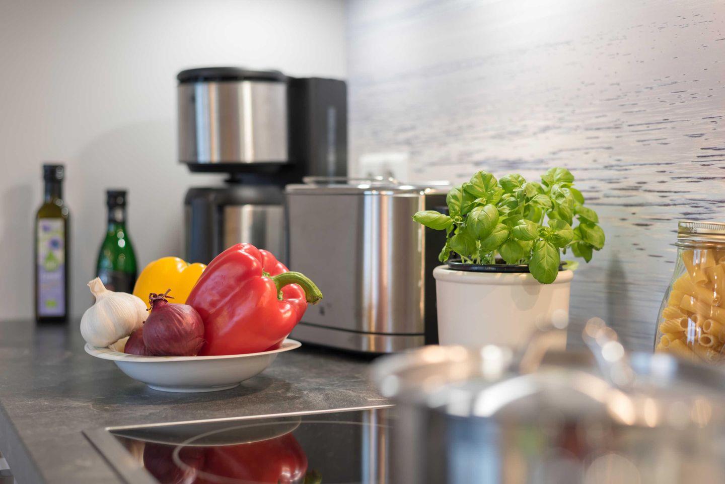 eine Kaffeemaschine, einen Wasserkocher und vom Kochtopf bis zum Eierbecher über
