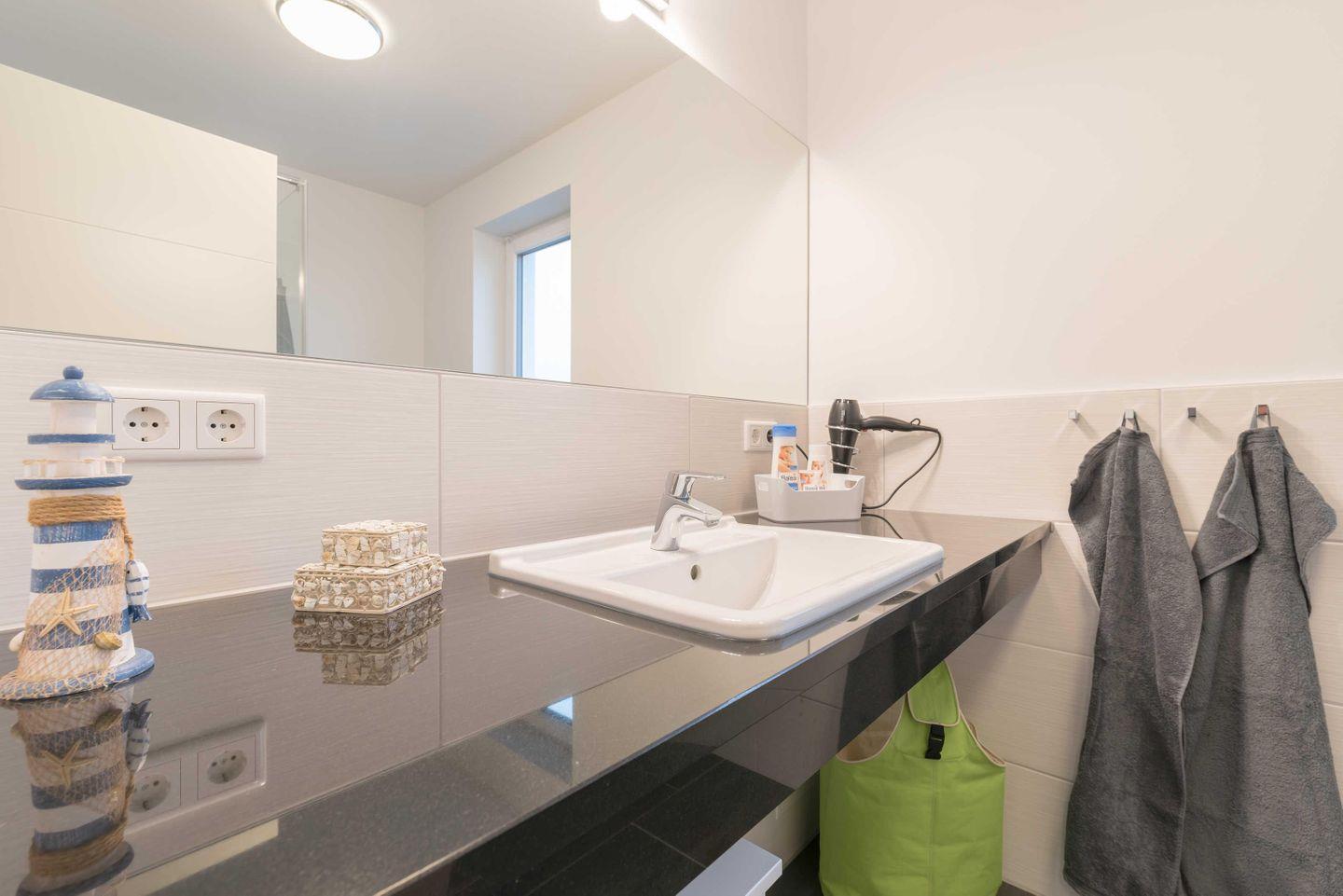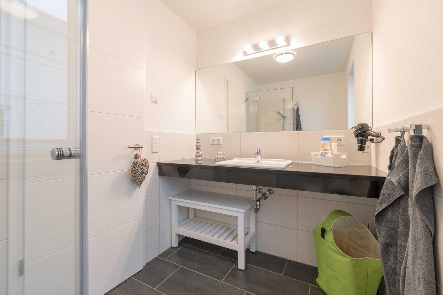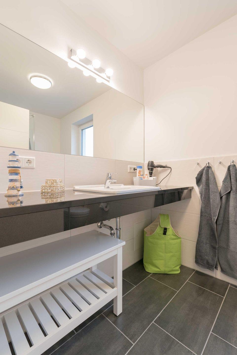 Spiegel, einem Haartrockner und Abstellmöglichkeiten für Ihre Waschutensilien.