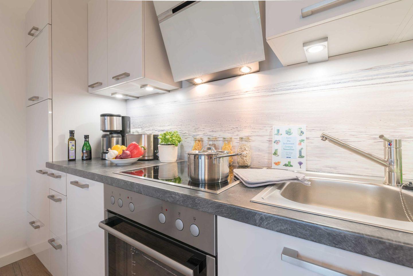 eine komplette Küchenausstattung. Das helle Badezimmer mit Fenster und