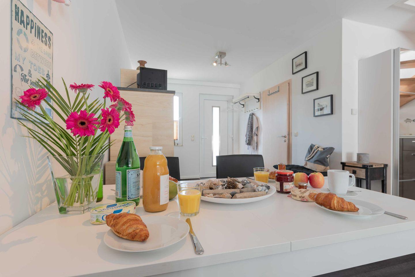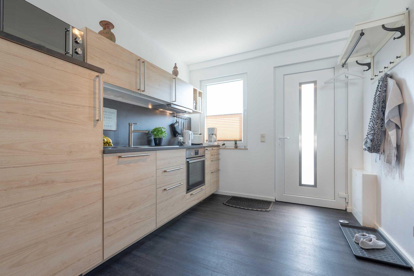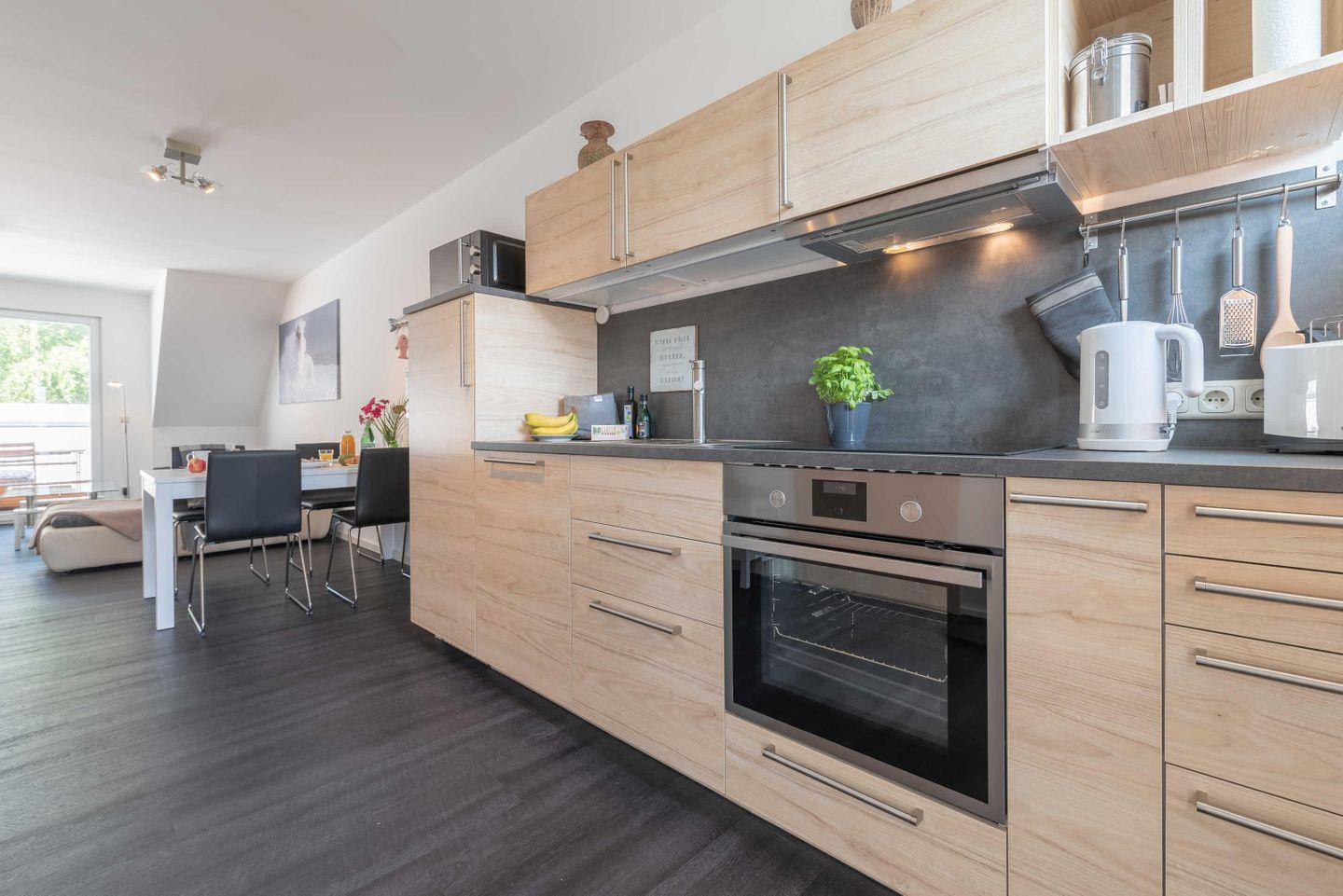 Der offene Wohn- und Essbereich ist ausgestattet mit einer modernen Einbauküche