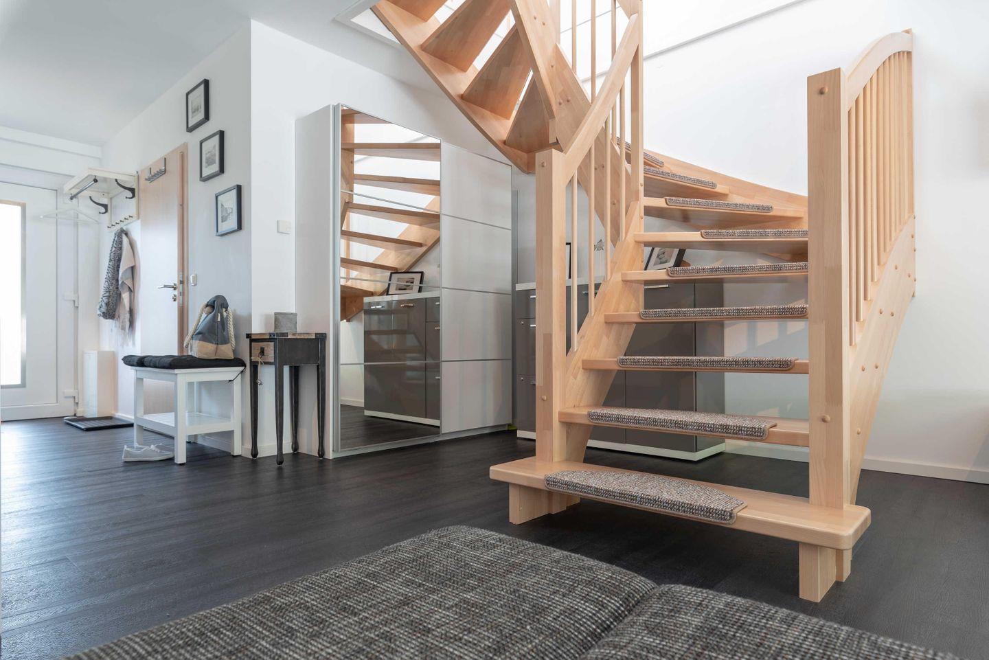 Über eine Treppe im Wohnbereich gelangt man in den Schlafbereich. Hier empfängen