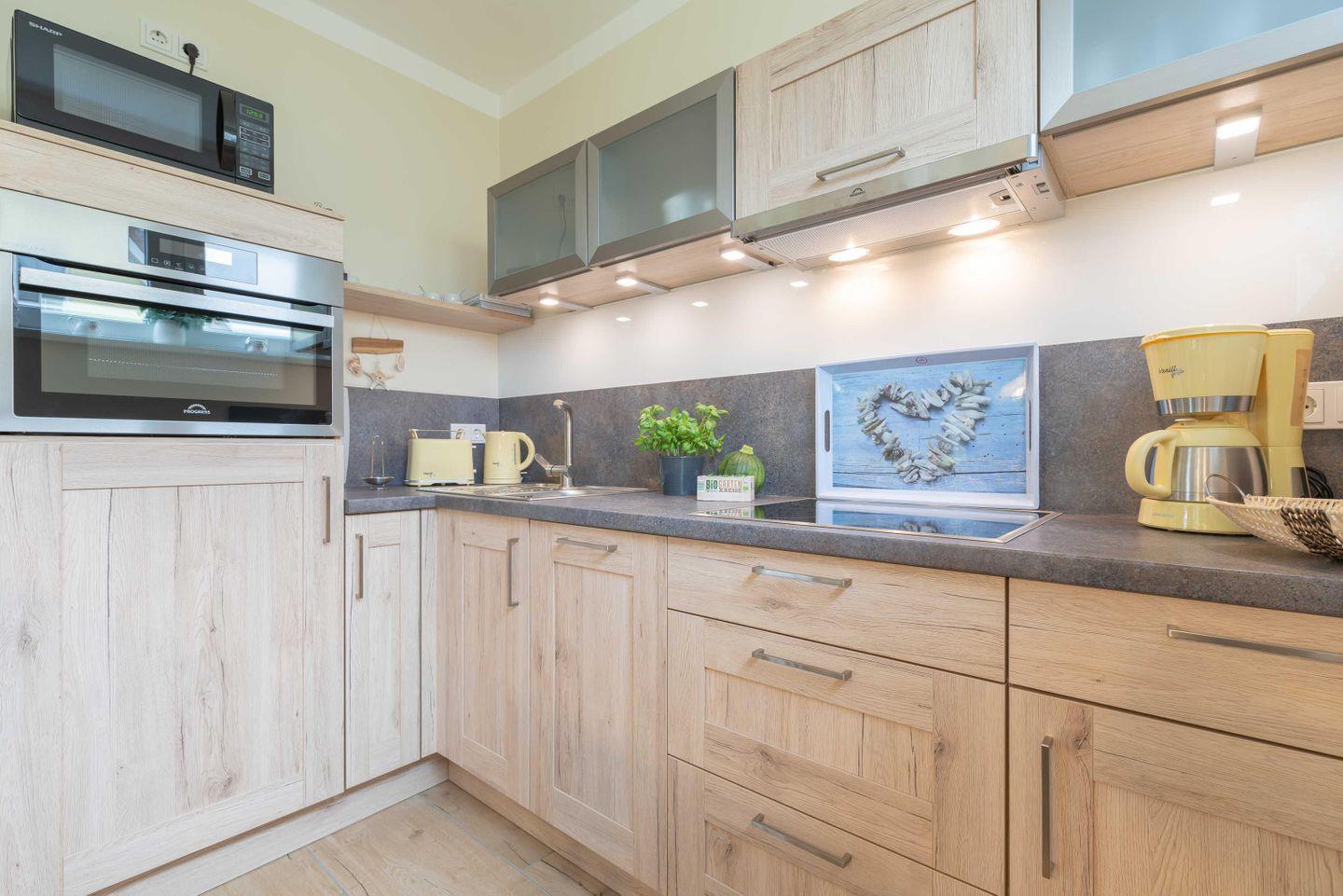 Eierkocher, Kaffeemaschine, Wasserkocher, Mikrowelle und Herd mit Cerankochfeld