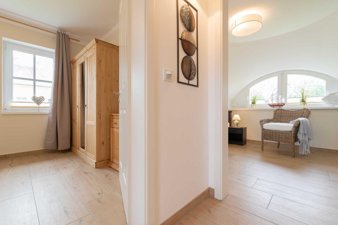 Schlafzimmer sind mit geräumigen Kleiderschränken, Sitzgelegenheiten und