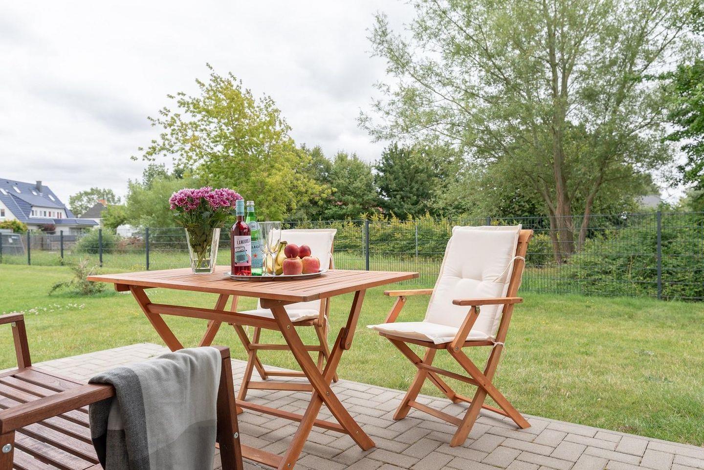 Angrenzend an die Rasenfläche lädt die Terrasse inkl. Gartenmöbel zu einem