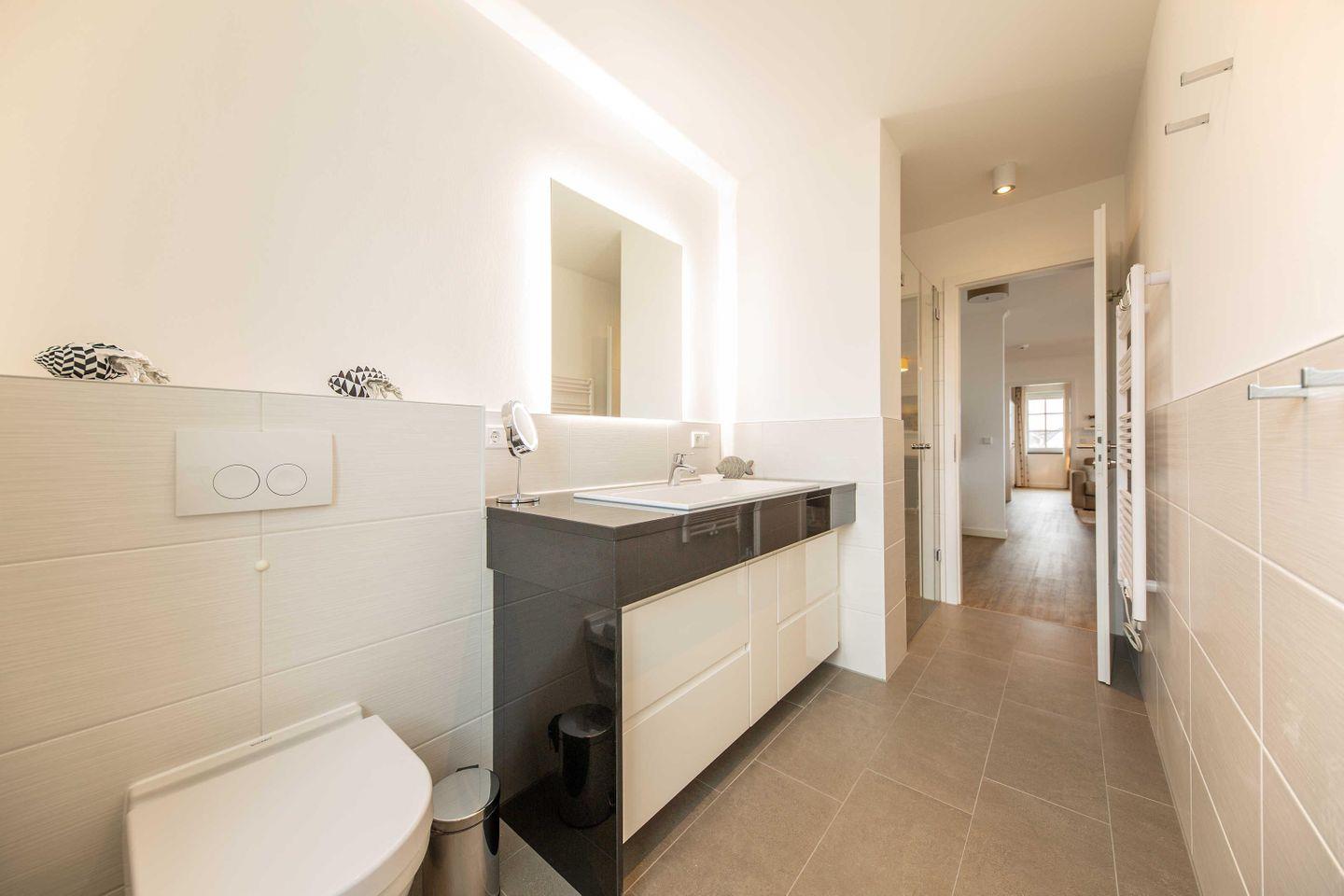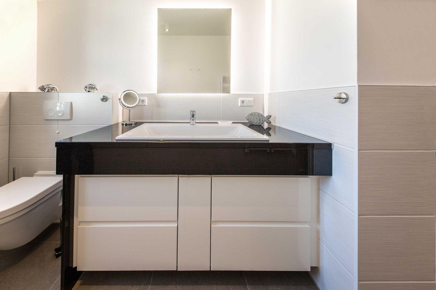 Das elegante Bad besticht mit einer bodengleichen Dusche, einem Waschtisch mit