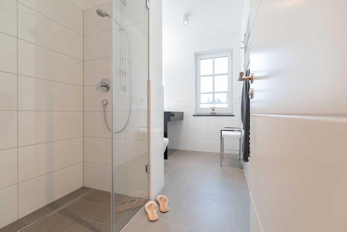 Wasserkocher. Im Tageslicht-Badezimmer befinden sich eine bodengleiche Dusche,
