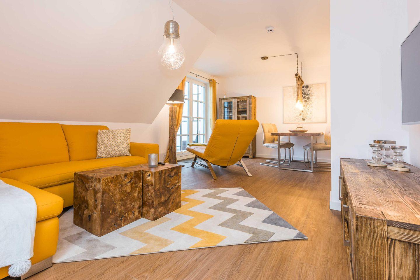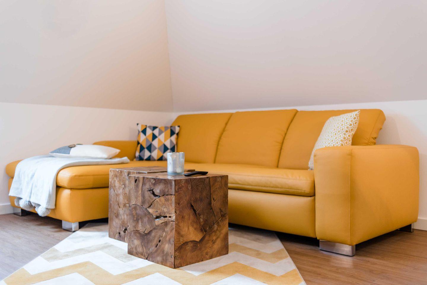 Das Wohnzimmer verfügt über eine bequeme Eck-Couch und eine verstellbare