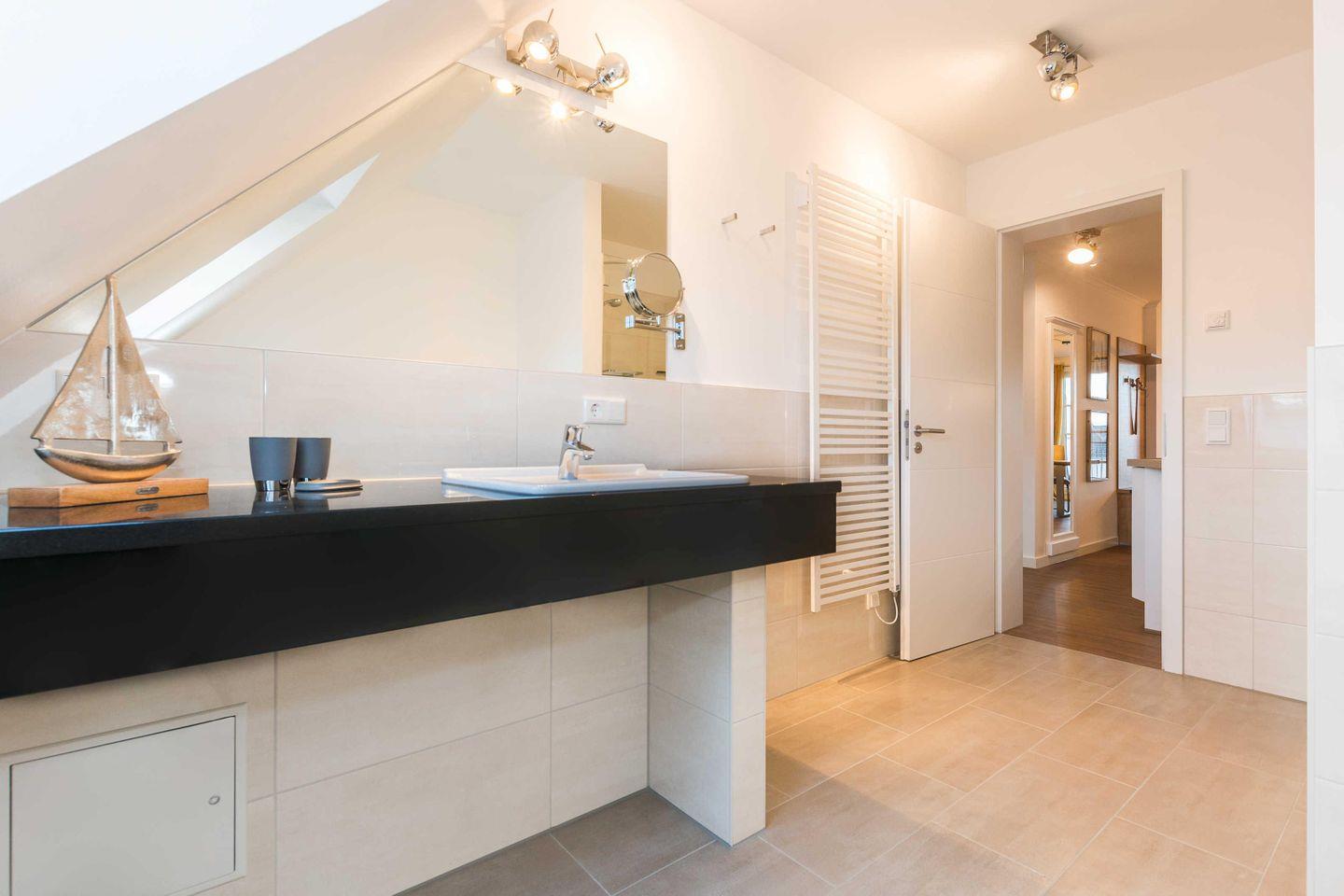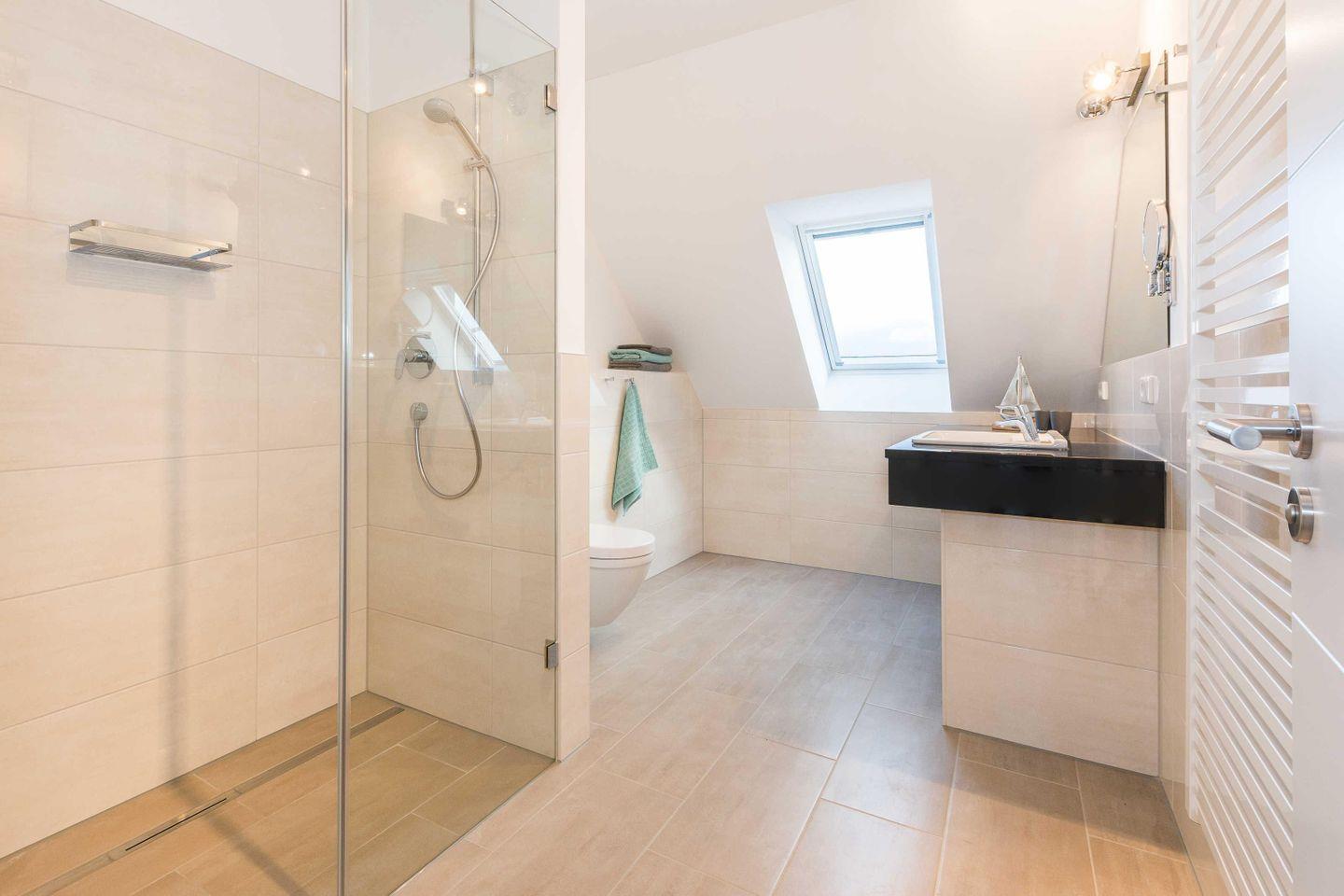 Tageslicht-Badezimmer befinden sich eine bodengleiche Dusche, ein großer