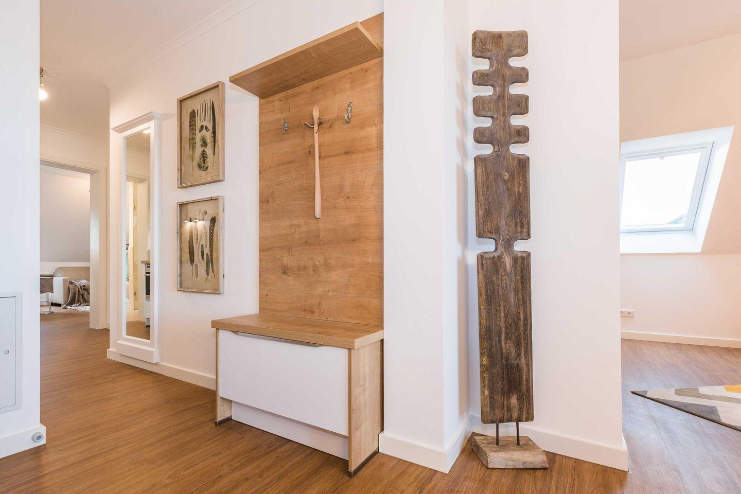 Waschtisch, ein Handtuchheizkörper und ein Haartrockner. Die Wohnung wurde mit
