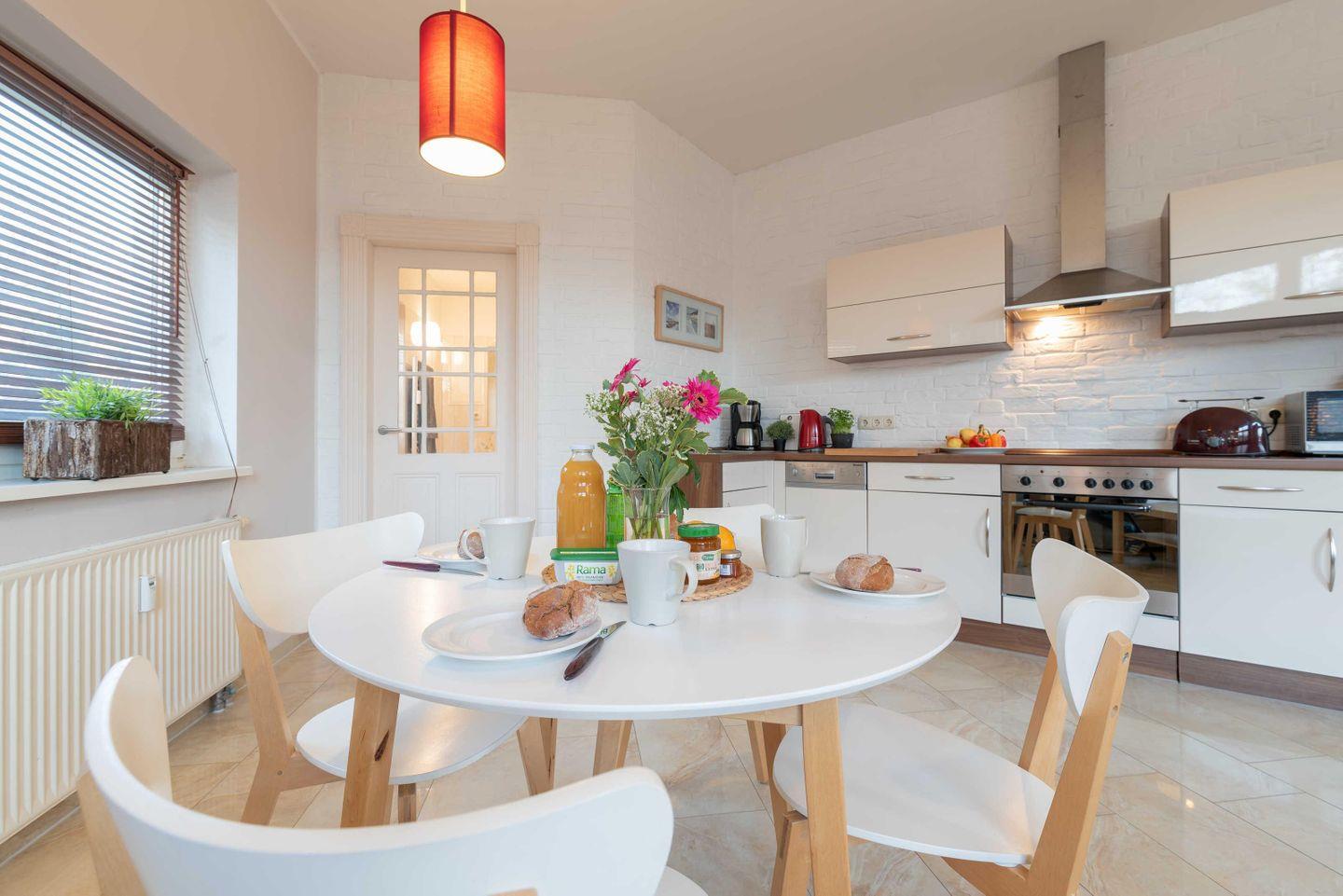 Diese ist ausgestattet mit 4-Platten-Ceran-Herd, Backofen, Geschirrspüler,