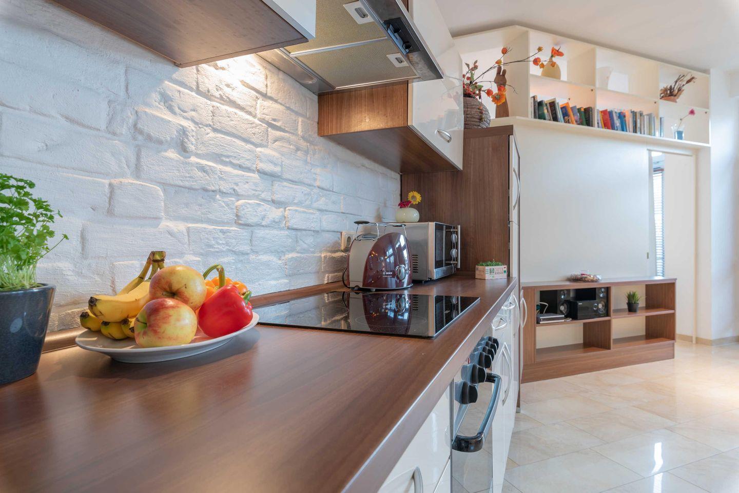 Toaster. Optisch mit einer Regalwand und Schiebetür vom Wohnbereich abgetrennt,