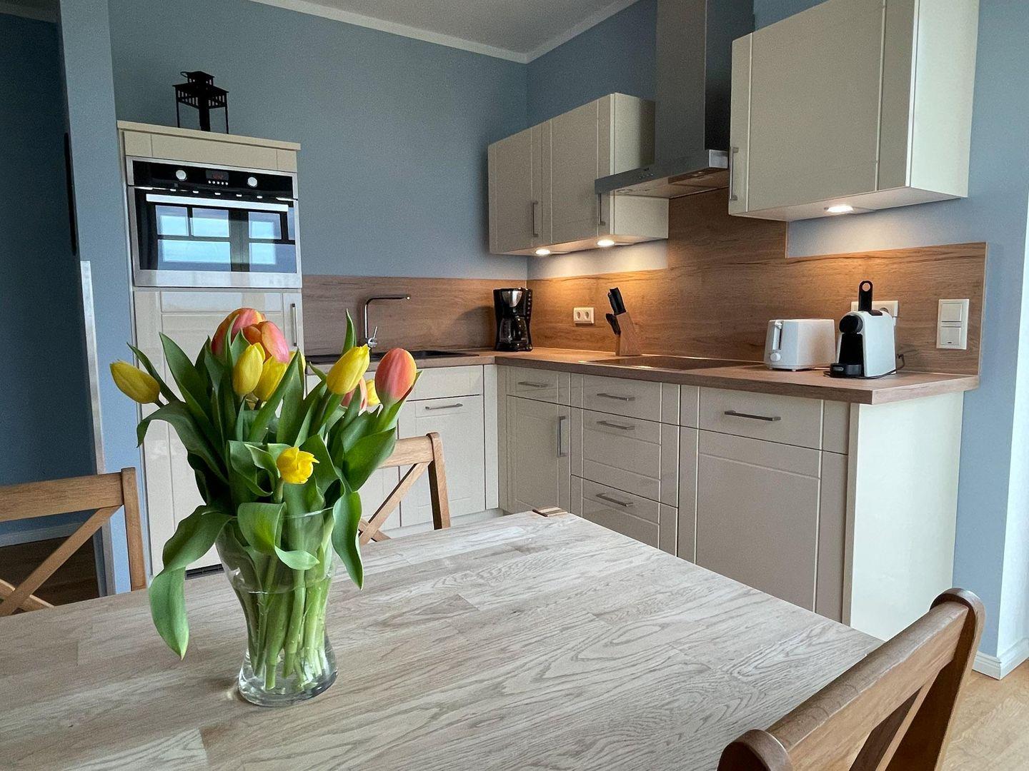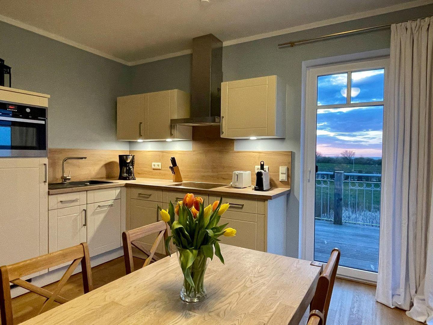 Die in den Wohn-/Essbereich integrierte Einbauküche verfügt über einen
