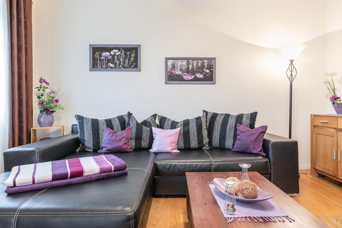 Der weite Wohn-/Essbereich empängt Sie mit einer geräumigen Ledercouch, einem
