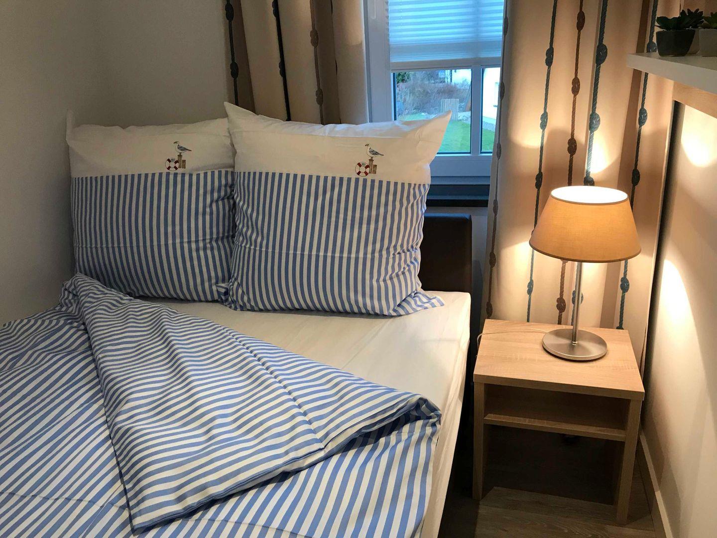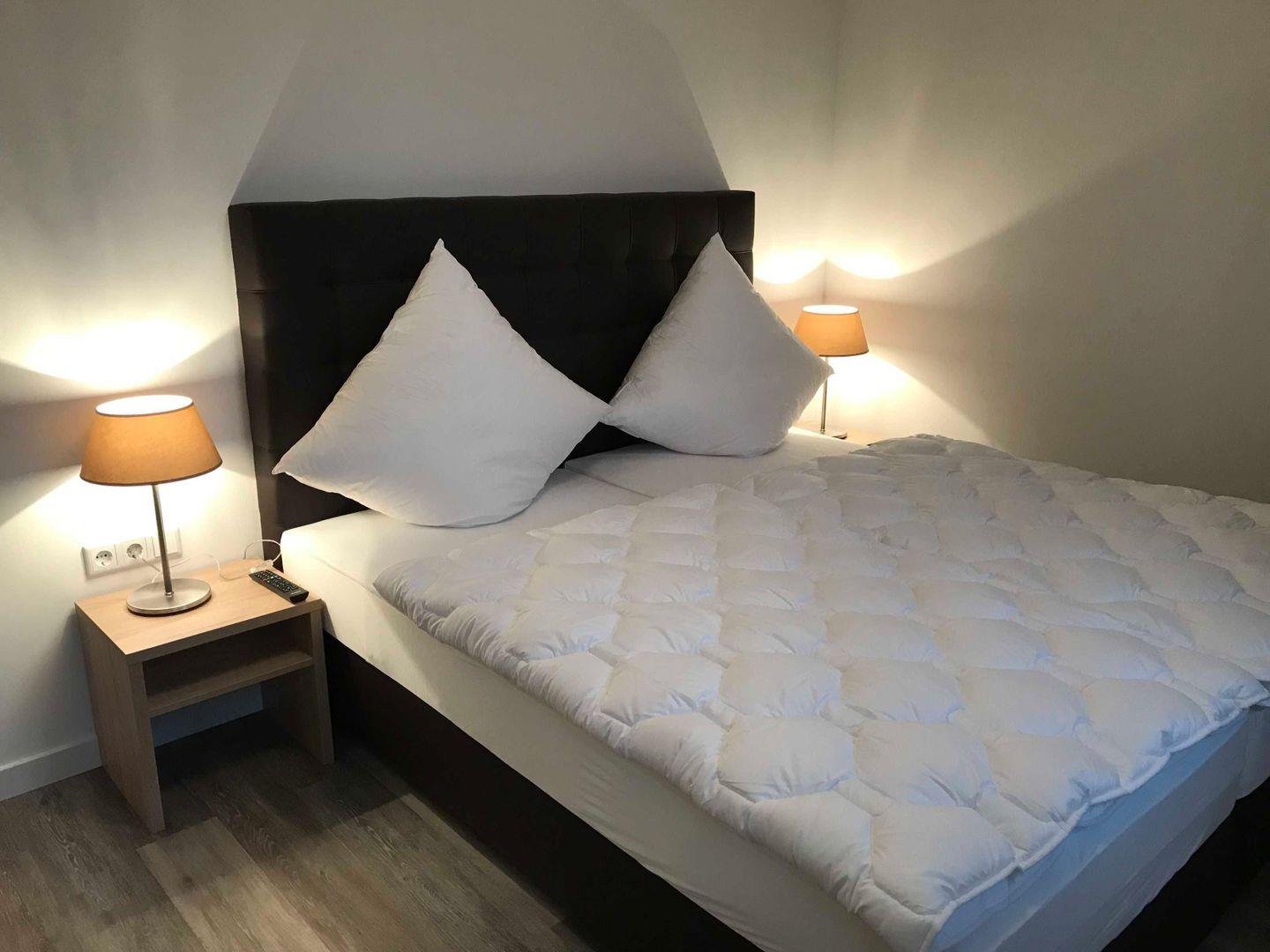 Schlafzimmer erwarten Sie ebenfalls ein gemütliches Boxspringbett (140 x 200 cm)