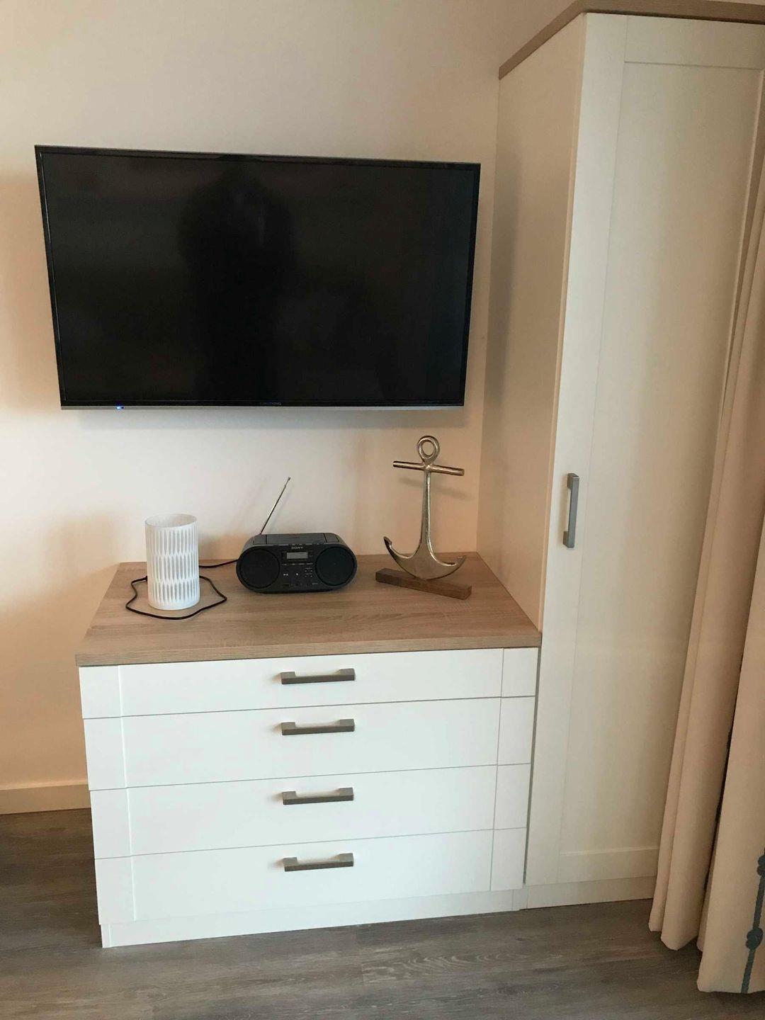 wird ergänzt durch einen Sessel, einen Hocker, einen Flat-TV, eine Musikanlage