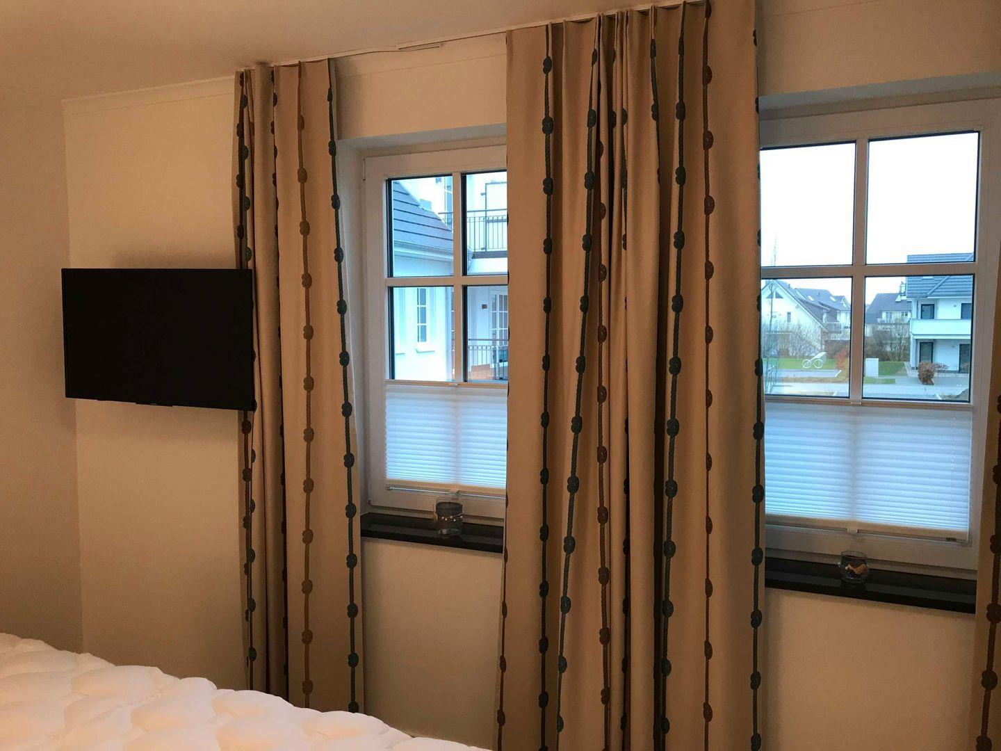 und ein Kleiderschrank. Beide Schlafzimmer sind mit Verdunklungsplissees sowie