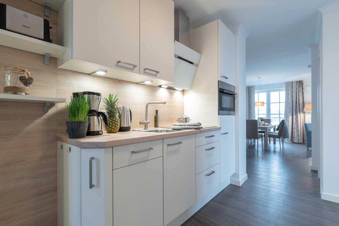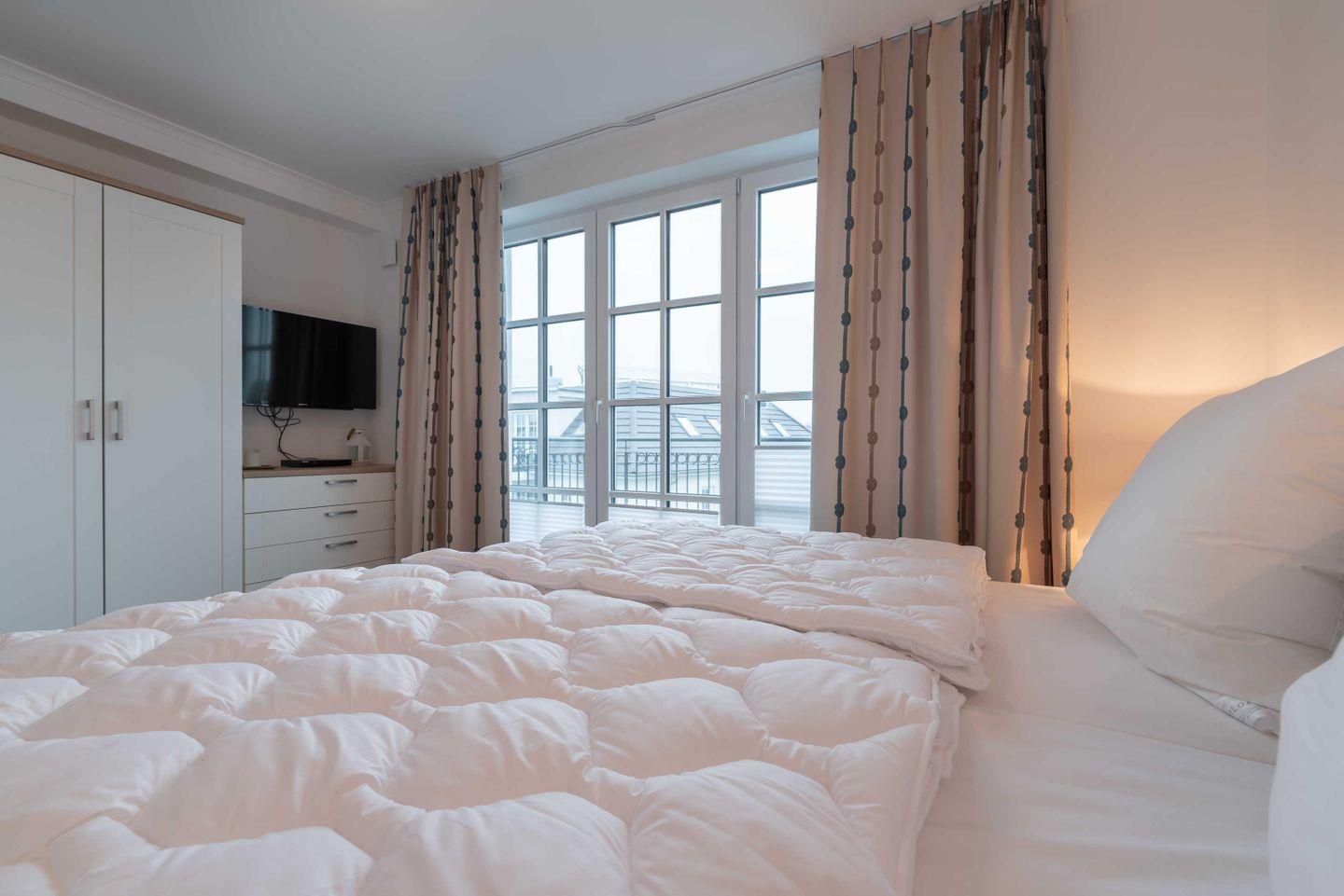 Herzstück der Wohnung ist der offene Wohn- und Essbereich. Eine gemütliche Sitzecke mit Eck-Couch (inkl. Schlaffunktion), zwei Sessel und ein Flat-TV laden zum Relaxen ein. In der hellen Wohnküche finden Sie alles, was Sie zum Kochen benötigen, inklusive einem Herd mit Glaskeramik-Kochfeld und Backofen, einer Kühl-Gefrierkombination, einem Geschirrspüler, modernen Küchengeräten und hochwertigem Geschirr. Der große Esstisch mit sechs Stühlen ist der ideale Platz für ausgiebiges Schlemmen und Zusammensitzen. Bodentiefe Fenster sorgen für viel Licht und führen auf einen der beiden Balkone mit Meerblick. Dort erwarten Sie komfortable Terrassenmöbel. Frühstücken Sie mit traumhaftem Ausblick oder lassen Sie den Tag bei einem Glas Wein am Abend Revue passieren – was kann es Schöneres geben? Zwei Schlafzimmer sorgen für erholsame Träume. Jedes Zimmer verfügt über einen großen Kleiderschrank für Ihr Urlaubsgepäck. Kommen Sie an und fühlen Sie sich wie zu Hause. Besonderen Komfort bietet das größere Schlafzimmer mit einem Boxspringbett mit Bandscheiben-Federkernmatratzen (1,80 x 2,00 m), einem weiteren Flat-TV sowie dem Zugang zum zweiten Meerblick-Balkon. Zusätzlich zum Hauptbad mit bodentiefer Dusche, einem großen Waschtisch, Wandspiegel und Föhn steht den Gästen ein zusätzliches separates WC zur Verfügung.