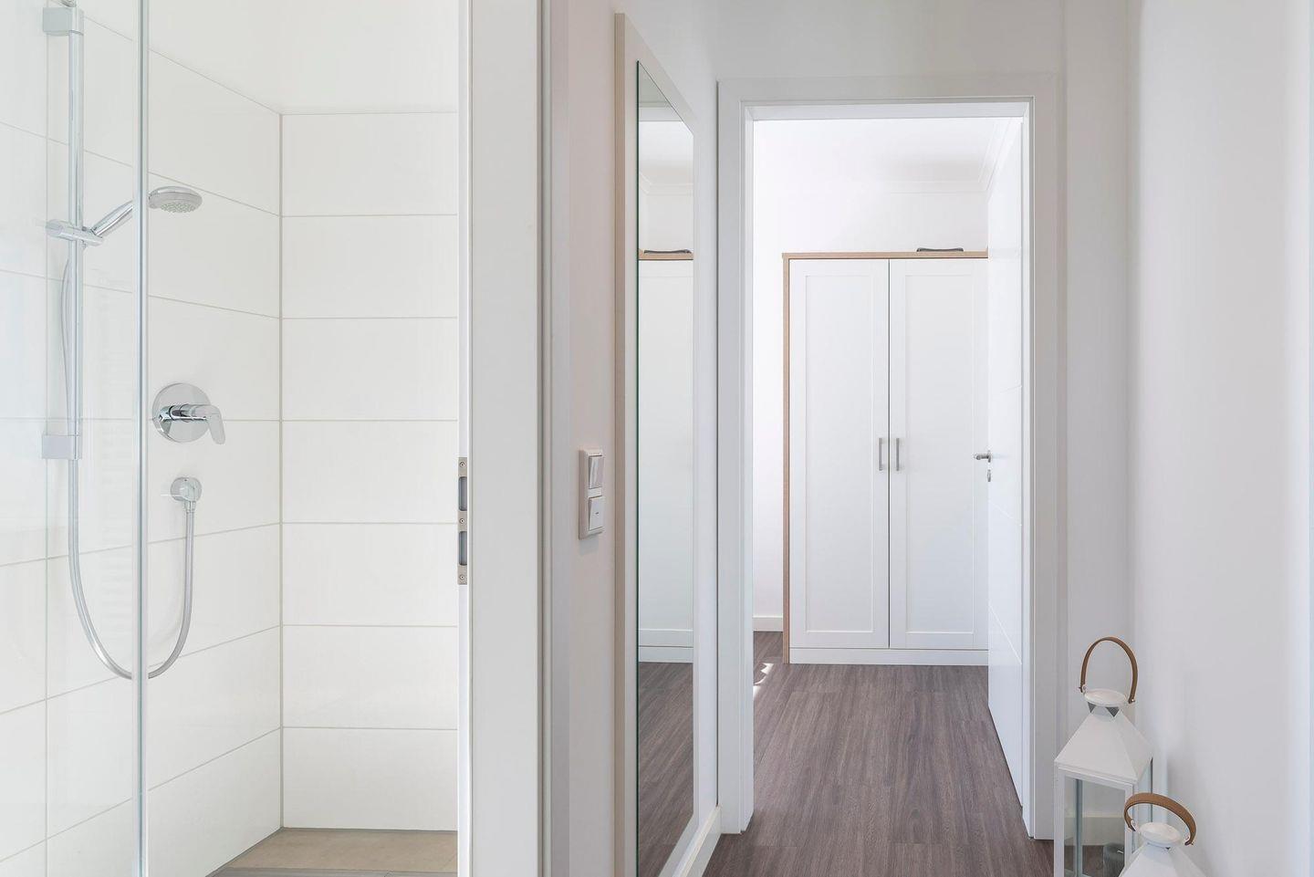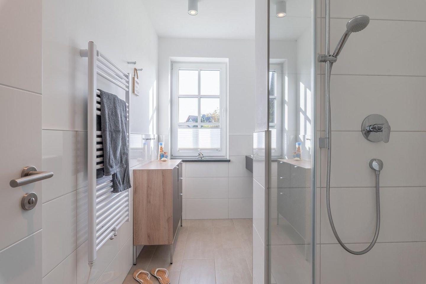 fünfte Person. Das Bad verfügt über eine ebenerdige Dusche, einen Waschtisch mit