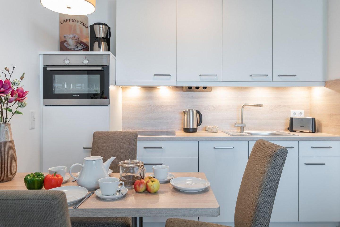 ausgestattet, dazu gehören Backofen, Ceran-Kochfeld, Kaffeemaschine,