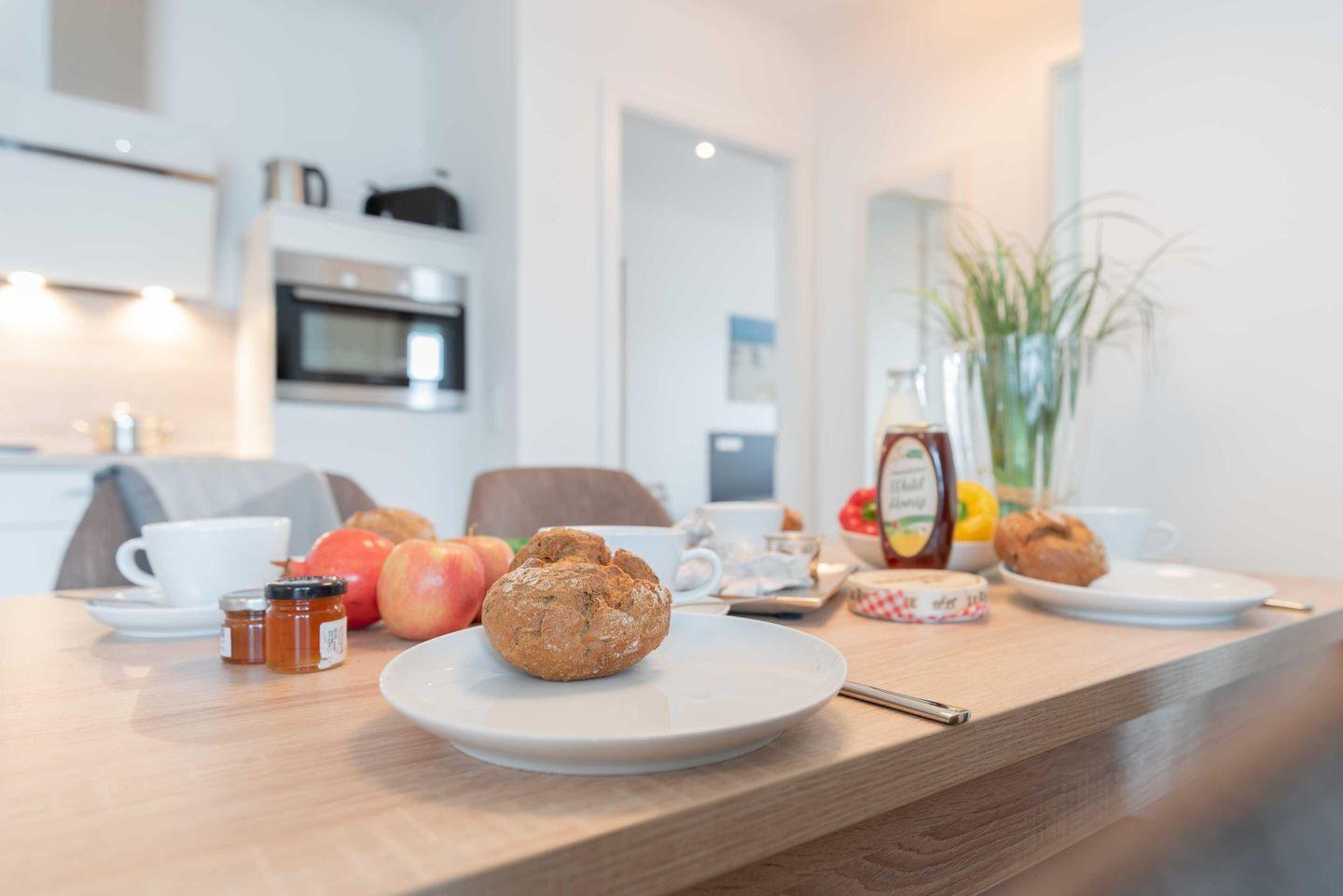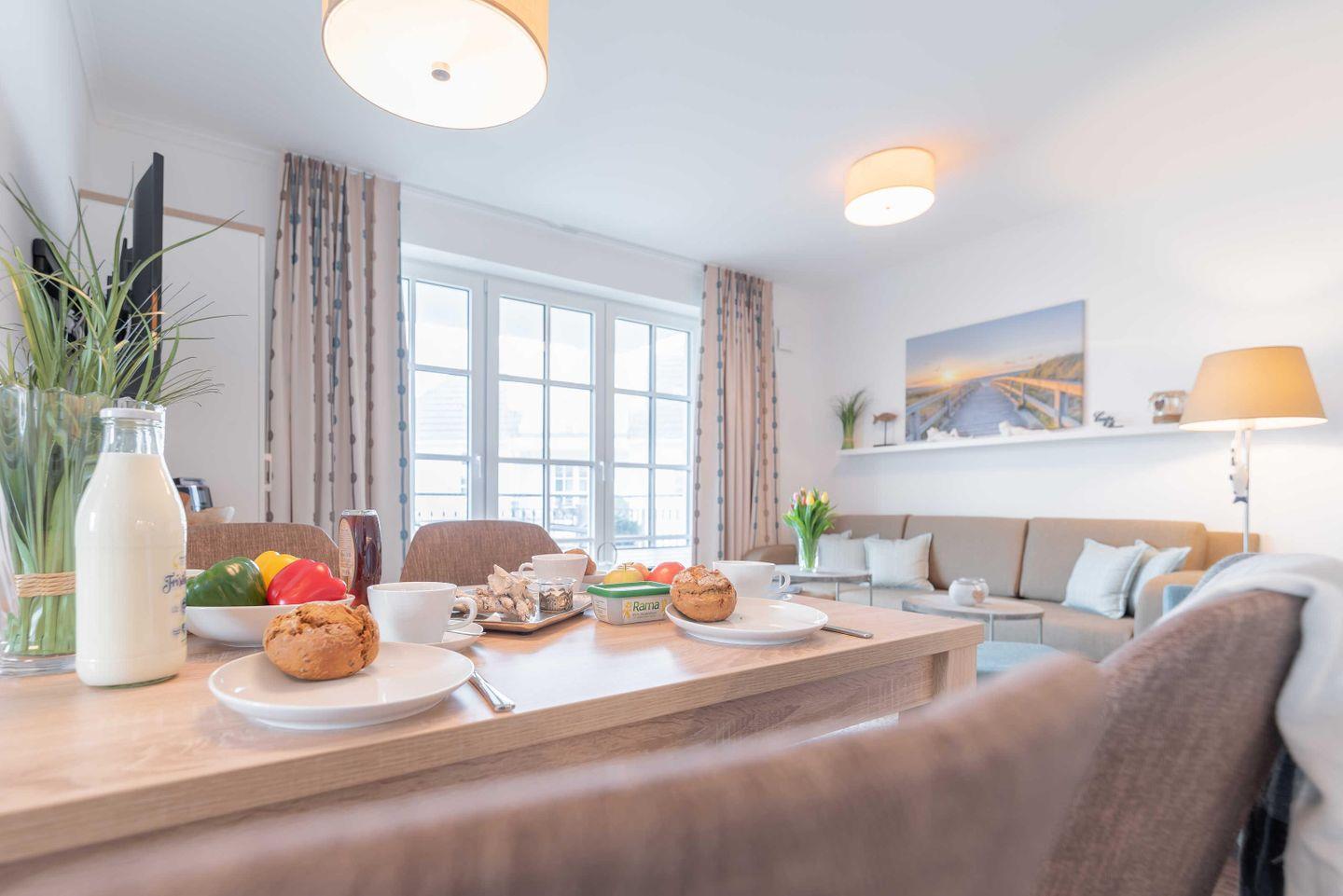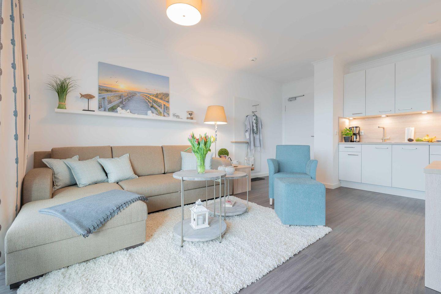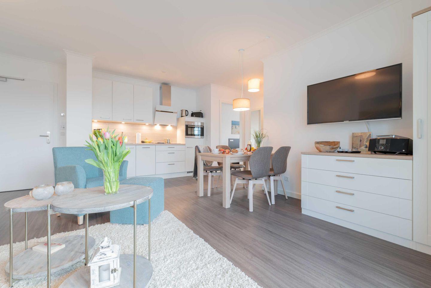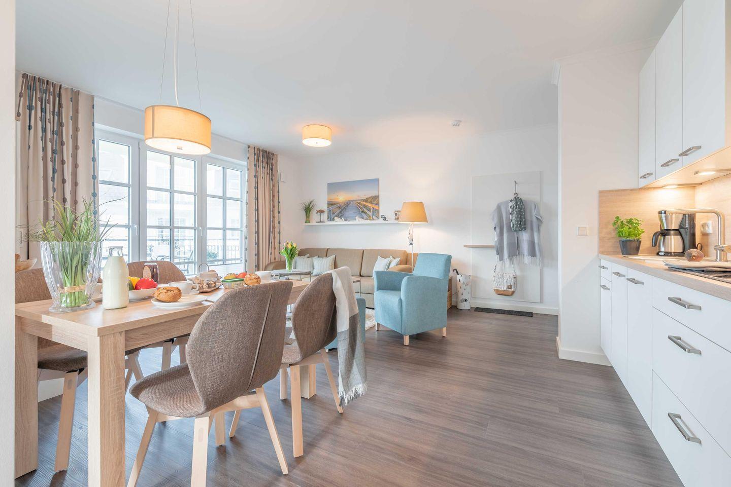 Der offene Wohn- und Essbereich ist modern und in einem zeitlos maritimen Stil