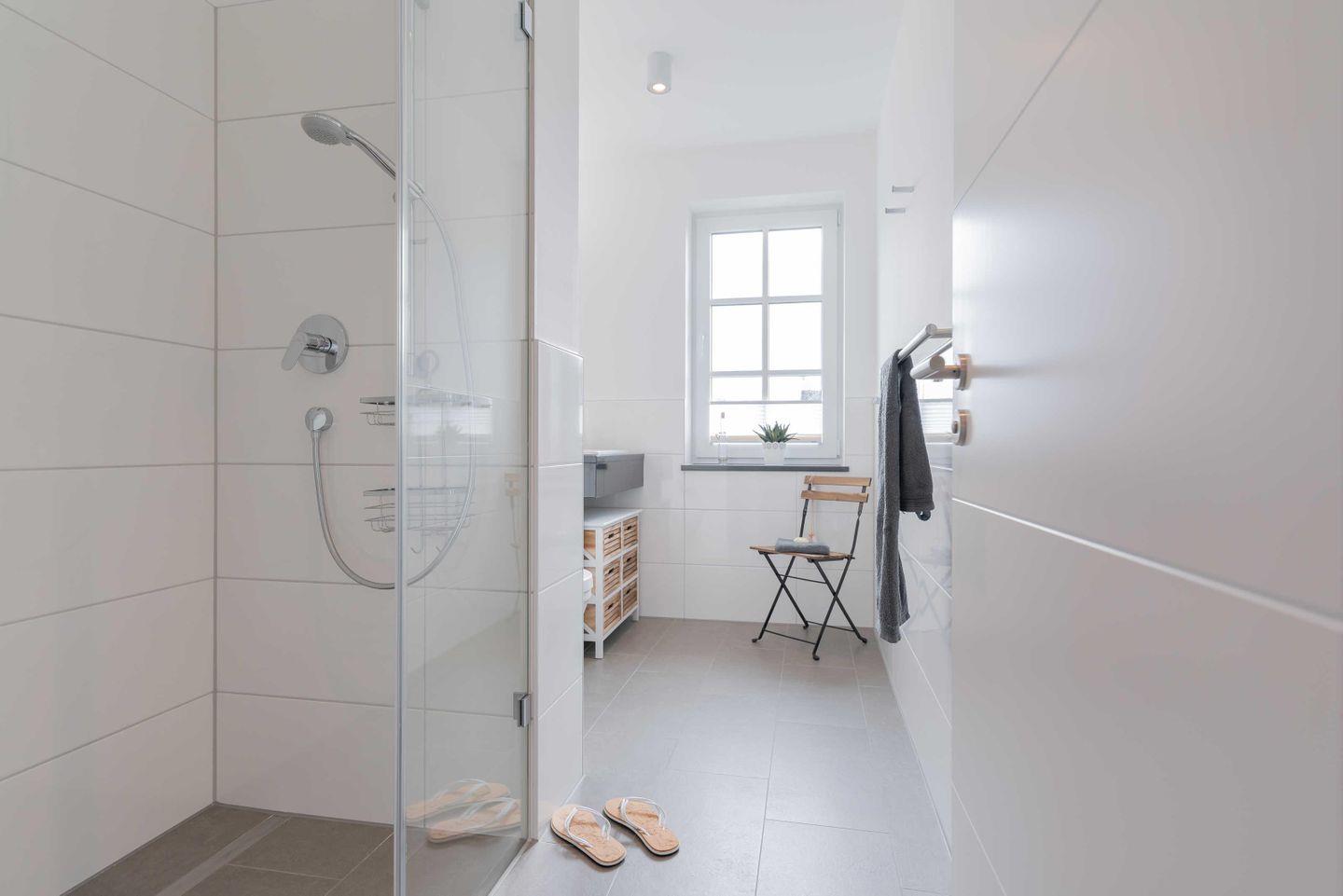 Badezimmer mit Fenster besticht mit einer ebenerdigen Dusche, einem großen