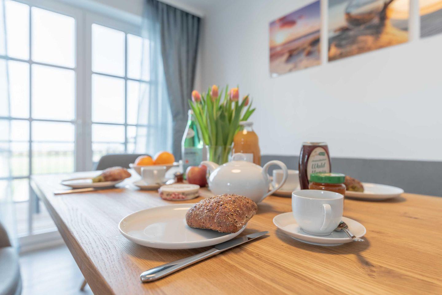 Das Esszimmer ist mit einem großen Esstisch sowie vier Stühlen und einer großen