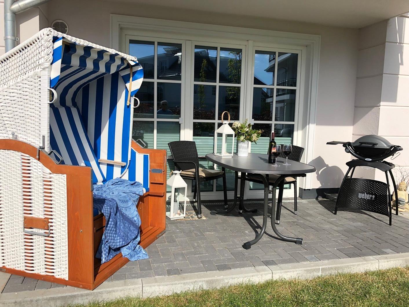 ist, hier laden ein Strandkorb, ein Sonnenschirm, ein Tisch mit vier Stühlen