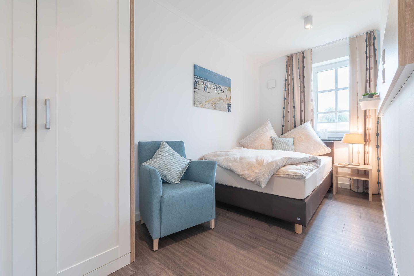 x 2,00 m, einen Kleiderschrank, einen Nachttisch sowie Wohlfühldeko.