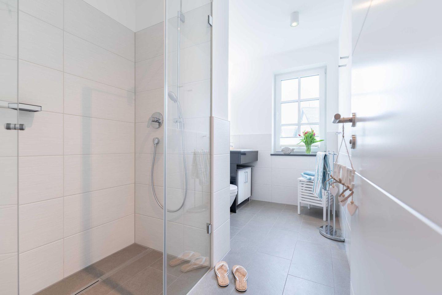 Ferienwohnung. Eine ebenerdige Dusche, ein Waschtisch mit Unterschrank und