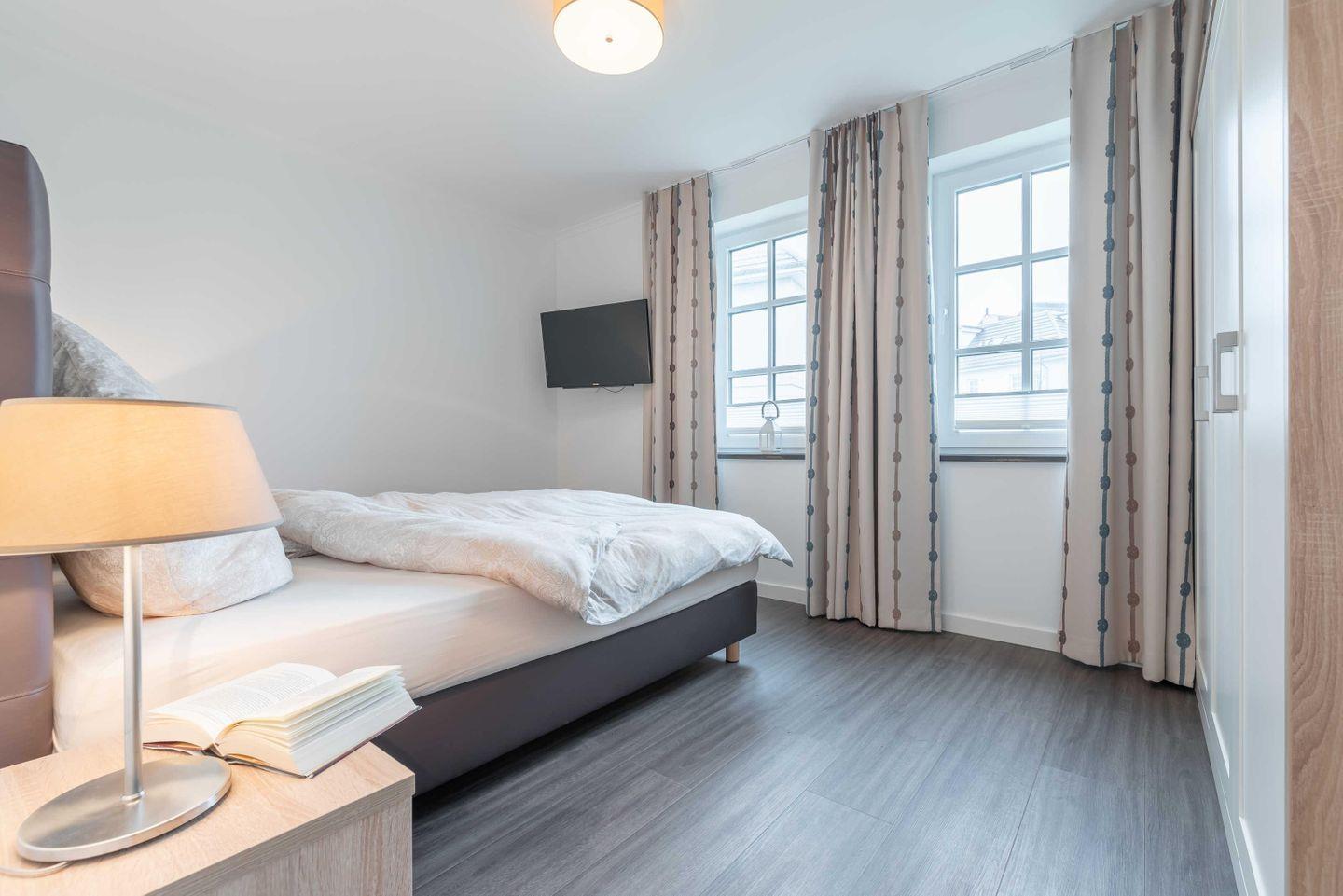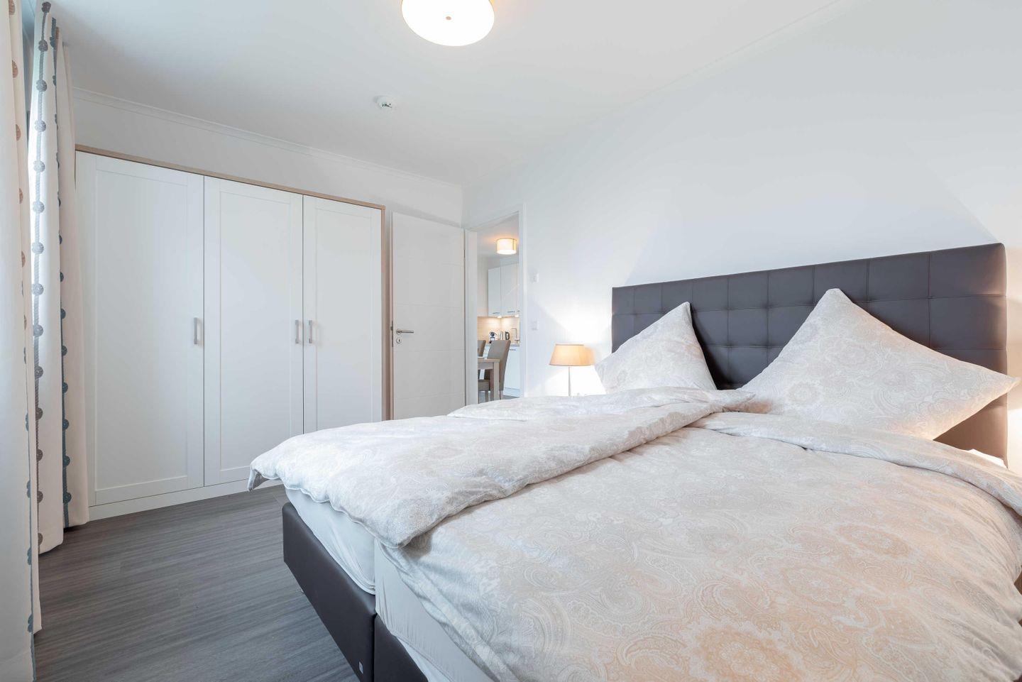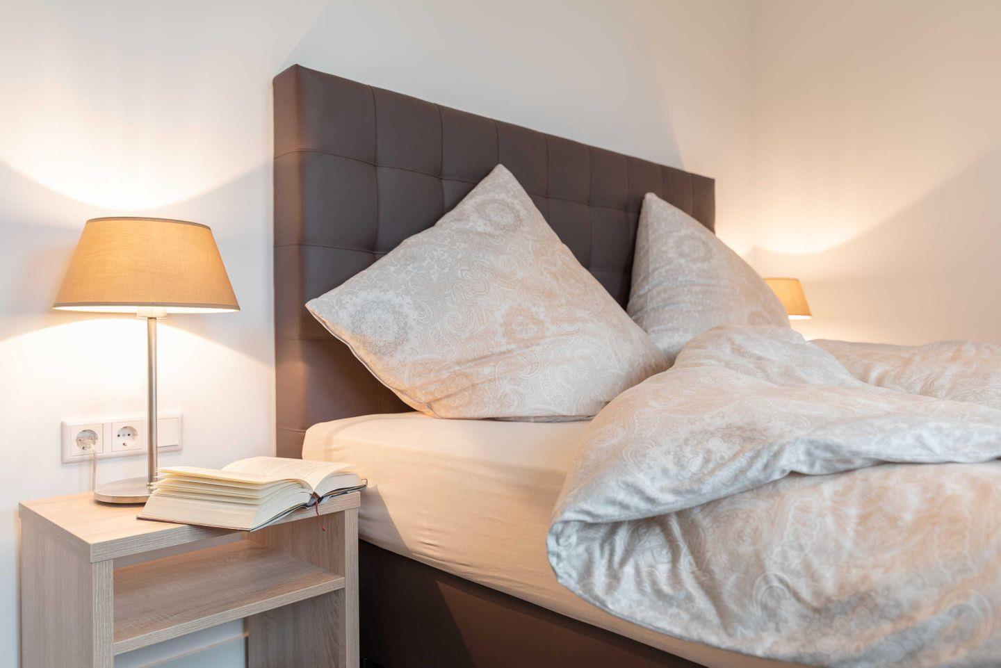 Im großen Schlafzimmer erwarten Sie ein Boxspringbett 1,80 x 2,00 m (zwei
