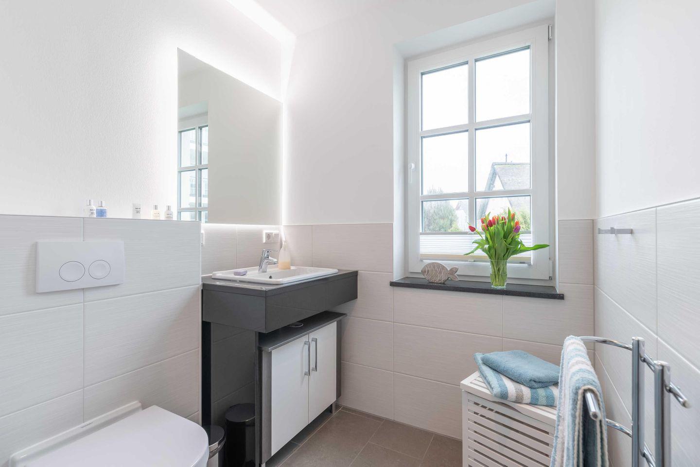 Das große Fenster erleuchtet Ihren Morgen im modern eingerichteten Bad der