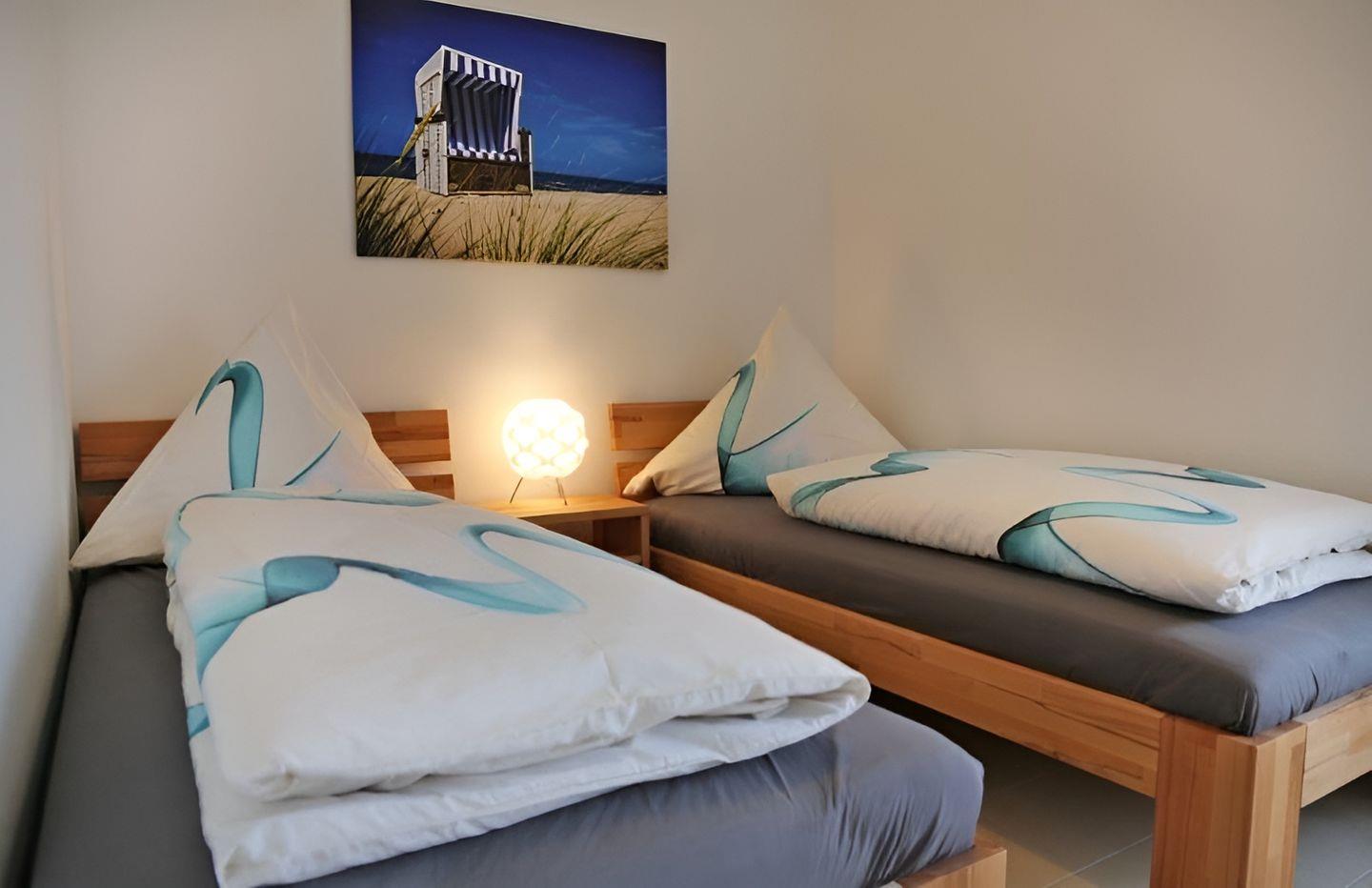 zwei Einzelbetten (jeweils 90 x 200 m) und einem extra Fernseher ausgestattet.