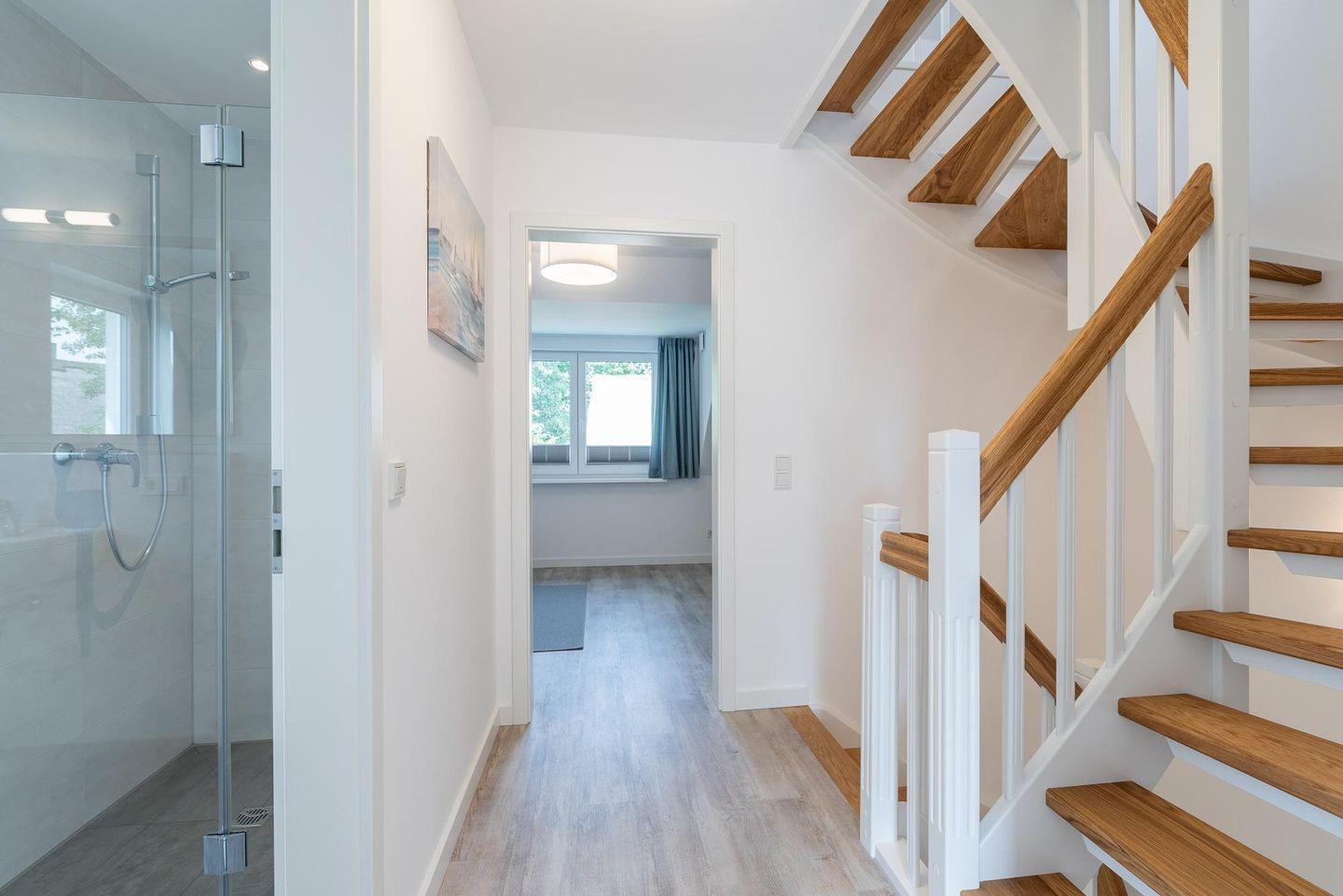 Im angrenzenden umzäunten Garten empfängt Sie eine nach Süden ausgerichtete Terrasse mit einer gemütlichen Sitzgruppe. Über eine hochwertige Treppenanlage erreichen Sie das Obergeschoss mit zwei Schlafräumen. Hier können Sie in 1,80 x 2,00 m breiten Doppelbetten Ihre „Urlaubsträume“ genießen. In beiden Schlafräumen sind ebenfalls TV/Tripletuner vorhanden. Ein weiteres Duschbad mit WC steht auf dieser Etage zur Verfügung. Bei Bedarf ist ein drittes Zimmer mit Doppelbett (1,80 x 2,00 m) im Spitzboden vorhanden.