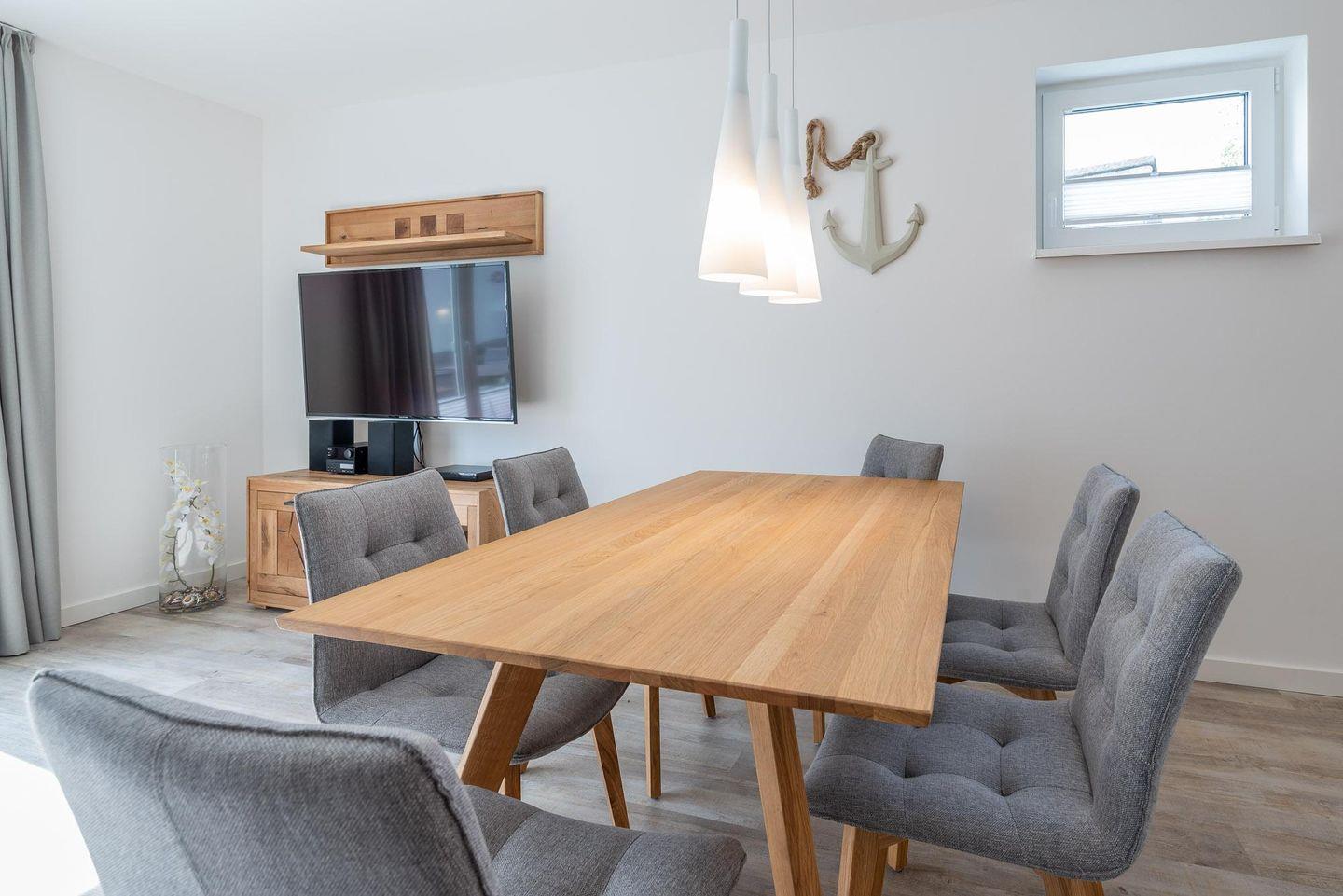 Durch Ihre eigene Haustür erreichen Sie das Erdgeschoss, die Diele ist mit Kleiderschrank und Schuhschrank möbliert. Rechts von der Diele ist ein Gäste-WC mit Duschbad untergebracht. Das helle Wohn-/Esszimmer lädt zum gemütlichen Verweilen ein. Hierzu gehören ein großer Massivholztisch mit sechs Sitzgelegenheiten, ein gemütliches Ecksofa und ein 139 cm TV/Tripletuner. Die offene Einbauküche in L-Form ist mit Markeneinbaugeräten ausgestattet.