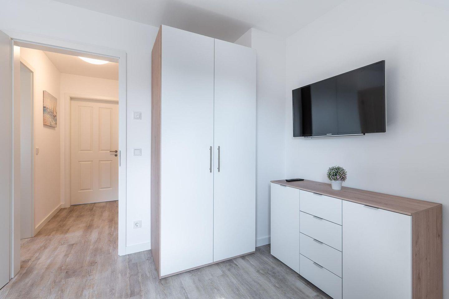 Kleiderschrank und Schuhschrank möbliert. Rechts von der Diele ist ein Gäste-WC