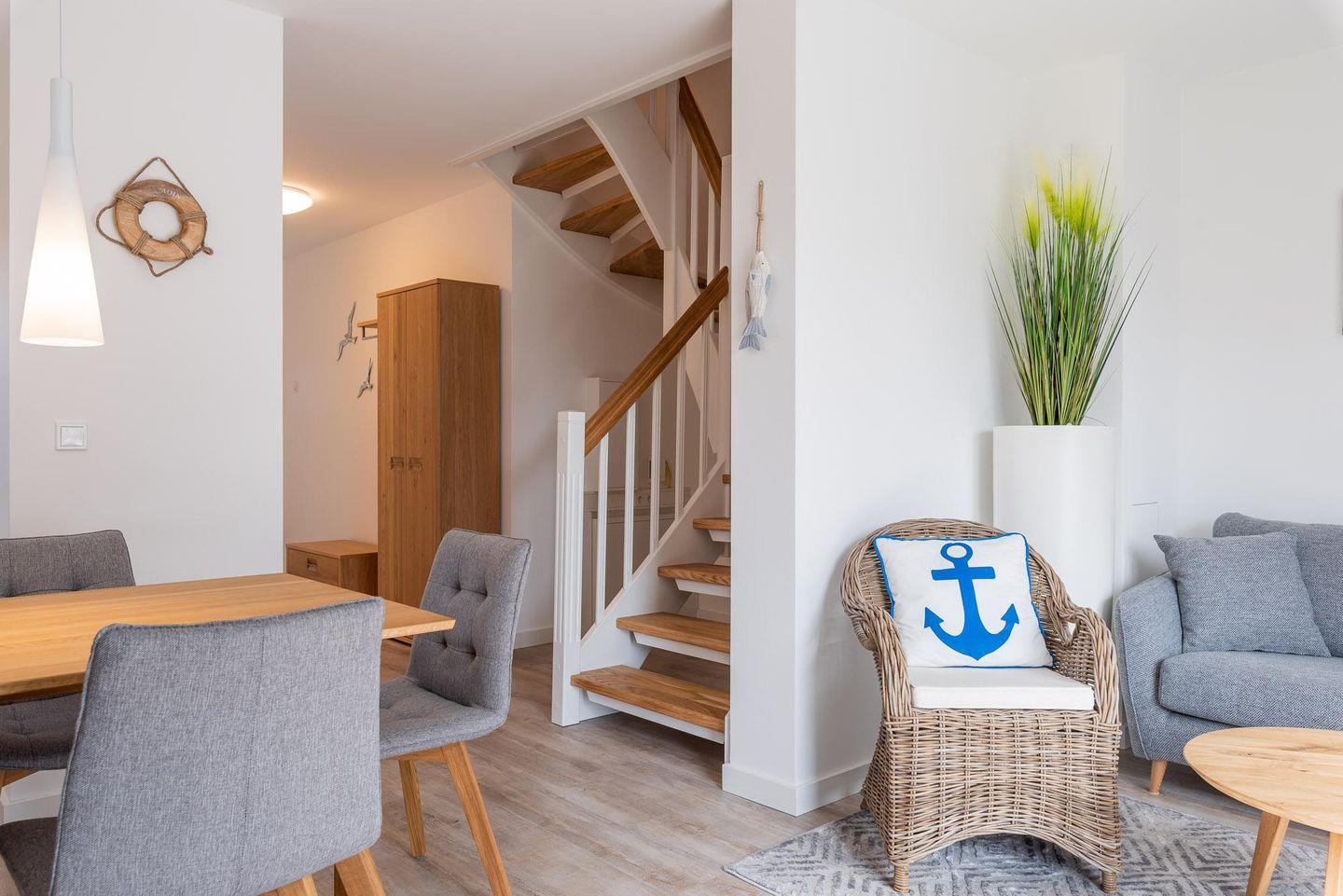 Das Strandhaus WE 02 bietet auf ca. 85 m² Platz für bis zu 6 Personen in drei Schlafzimmern. Genießen Sie eine moderne, offen gestaltete Küche, einen lichtdurchfluteten Wohnbereich, eine eigene Terrasse mit Gartenblick sowie kostenfreies WLAN und einen Privatparkplatz. Der Strand ist nur 450 Meter entfernt, Restaurants und Einkaufsmöglichkeiten sind bequem erreichbar.