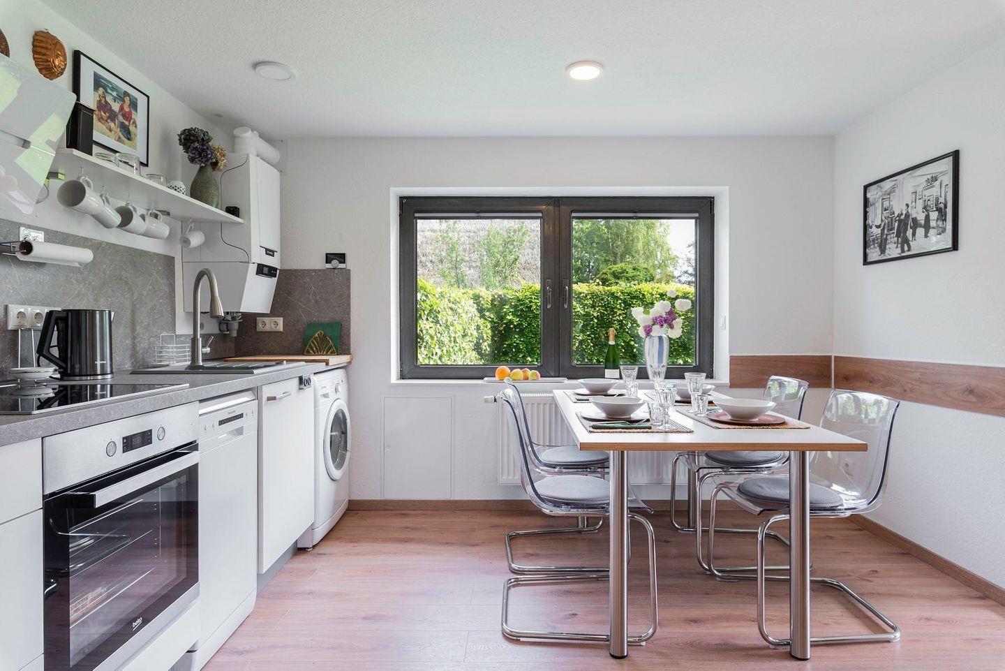 Unser reetgedecktes Haus erstreckt sich über zwei Ebenen. Die Küche ist voll ausgestattet und am großen Esstisch finden bis zu sechs Personen Platz. Eine Waschmaschine steht eben frei zur Nutzung bereit. Das Wohnzimmer besticht mit einem geräumigen Ecksofa. Das erste Schlafzimmer empfängt Sie mit einem Doppelbett (160 x 200 cm). Im zweiten Schlafzimmer erwarten Sie ein Doppelbett (140 x 200 cm) und eine Rècamière (80 x 200 cm). Das Badezimmer verfügt über ein modernes Design mit Dusche. Die 25 qm große Terrasse ist teilweise überdacht und wird seit 55 Jahren vom Frühjahr bis spät in den Herbst hinein als zweites Wohn- / Esszimmer und abendlicher Stammtisch genutzt.
