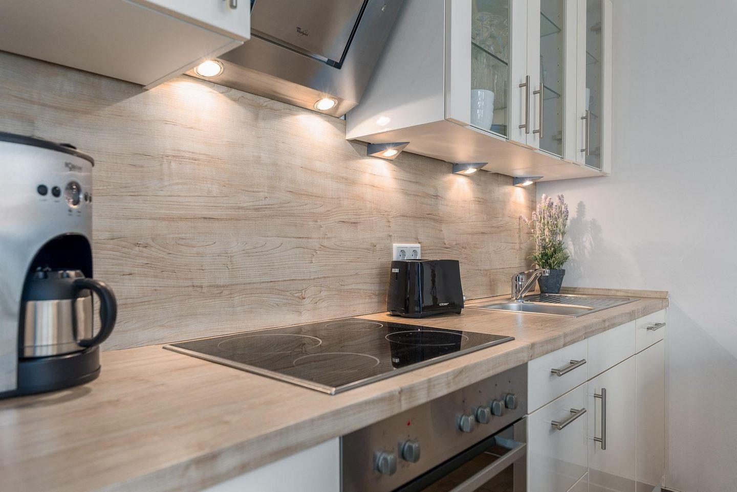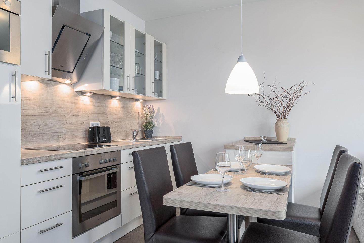 Die offene EINBAUKÜCHE ist neben der Standardbestückung mit Geschirrspüler, Kühlschrank, inklusive Gefrierfach, Backofen, Cerankochfeld und Mikrowelle ausgestattet worden.