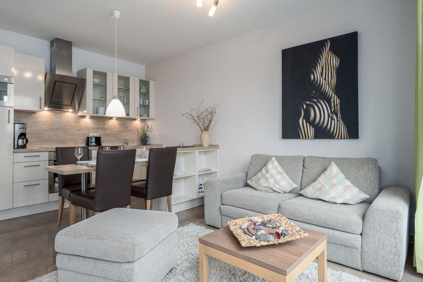 Es empfängt Sie ein stilvoll eingerichtetes Wohn-/ ESSZIMMER mit Zweisitzer-Couch (ausziehbar/ Liegefläche 140 x 200 cm), Hocker, Flatscreen-TV und Radio sowie Esstisch mit vier Stühlen. Von hier gelangen Sie auf den herrlichen BALKON in Westausrichtung mit Blick auf den nahegelegenen Deich.