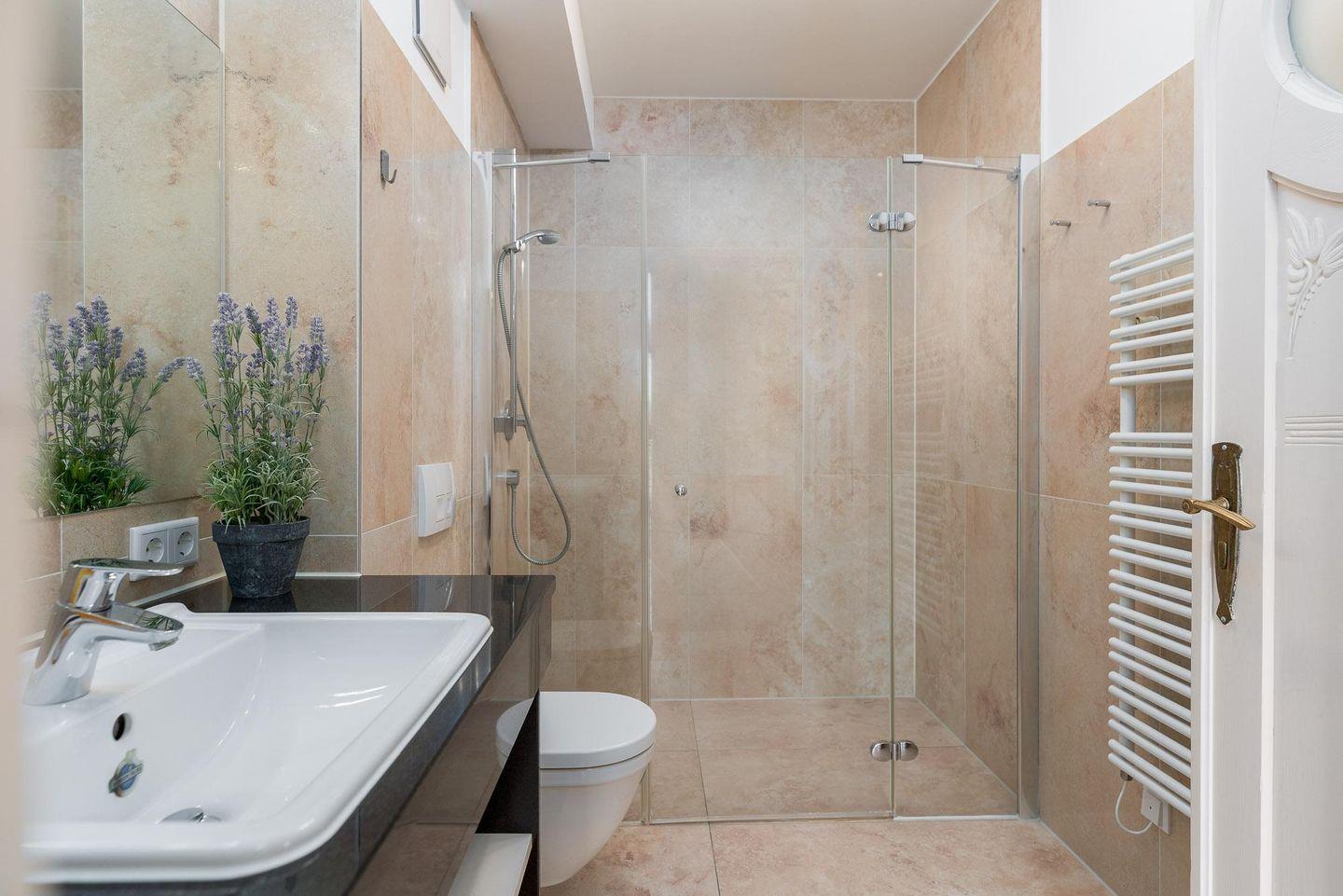 Das DUSCHBAD besticht mit bodengleicher Dusche, Föhn und Handtuchtrockner. Die eingebaute Fußbodenheizung sorgt auch an kalten Tagen für wohlige Wärme in allen Räumen.
