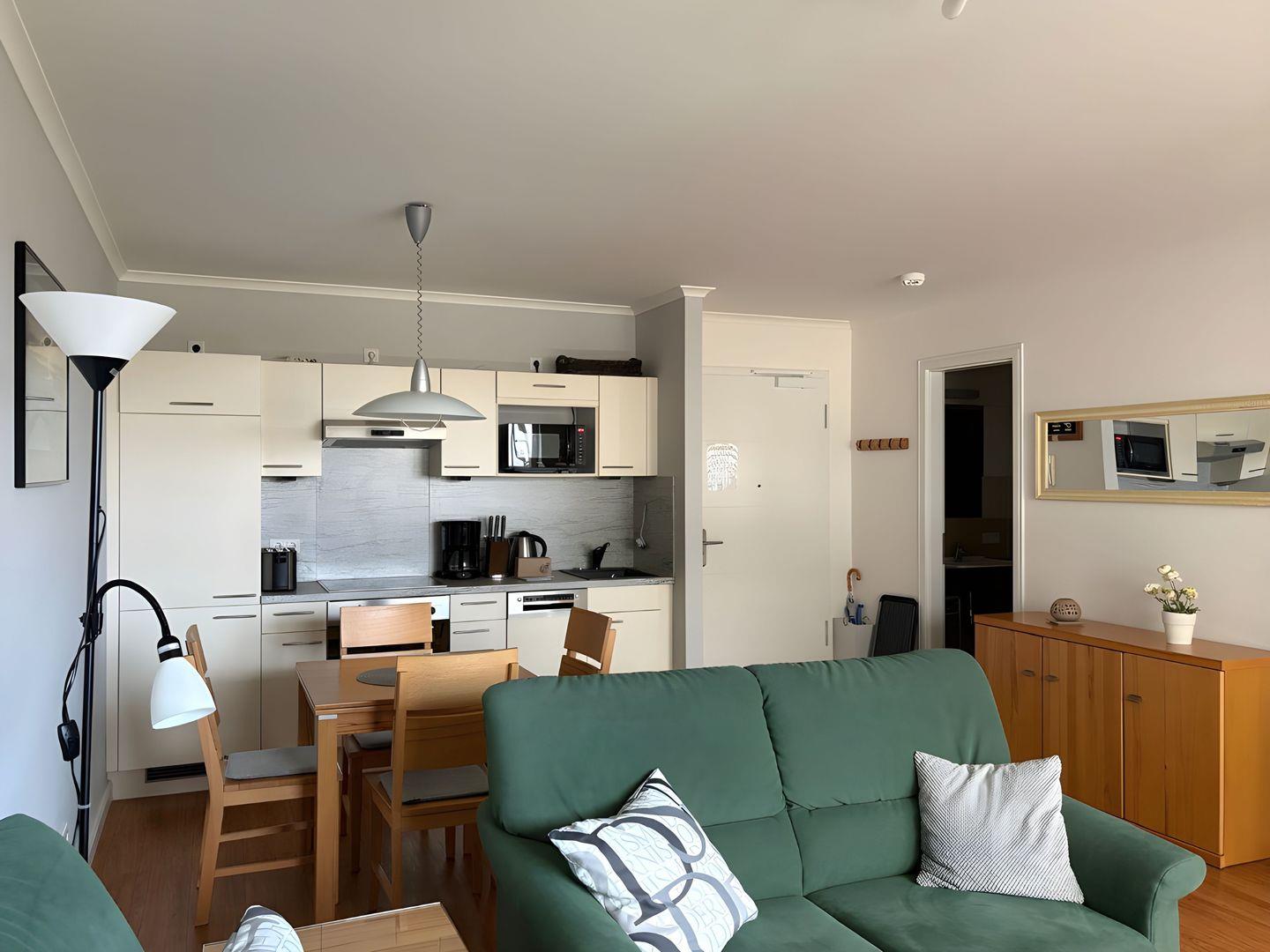 Die Villa Bernstein WE 13 in Börgerende bietet auf ca. 53 m² ein komfortables Apartment mit einem Schlafzimmer, offenem Wohnbereich und voll ausgestatteter Küche. Genießen Sie den eingeschränkten Meerblick vom Balkon, kostenfreies WLAN, einen eigenen Parkplatz sowie die Nähe zum Strand und zur Stadt. Ein Aufzug, gemeinschaftliche Waschmaschine und Trockner runden das Angebot ab.