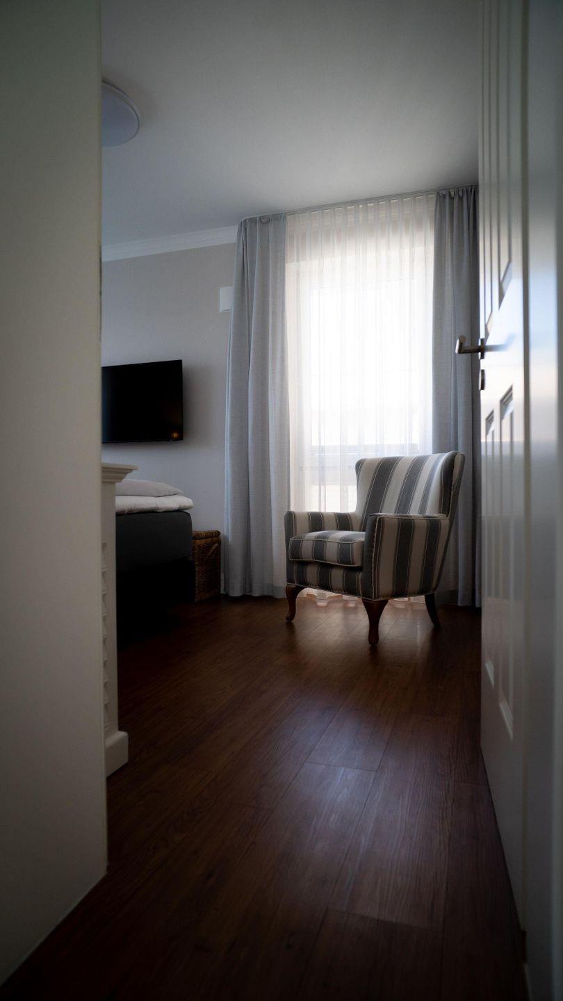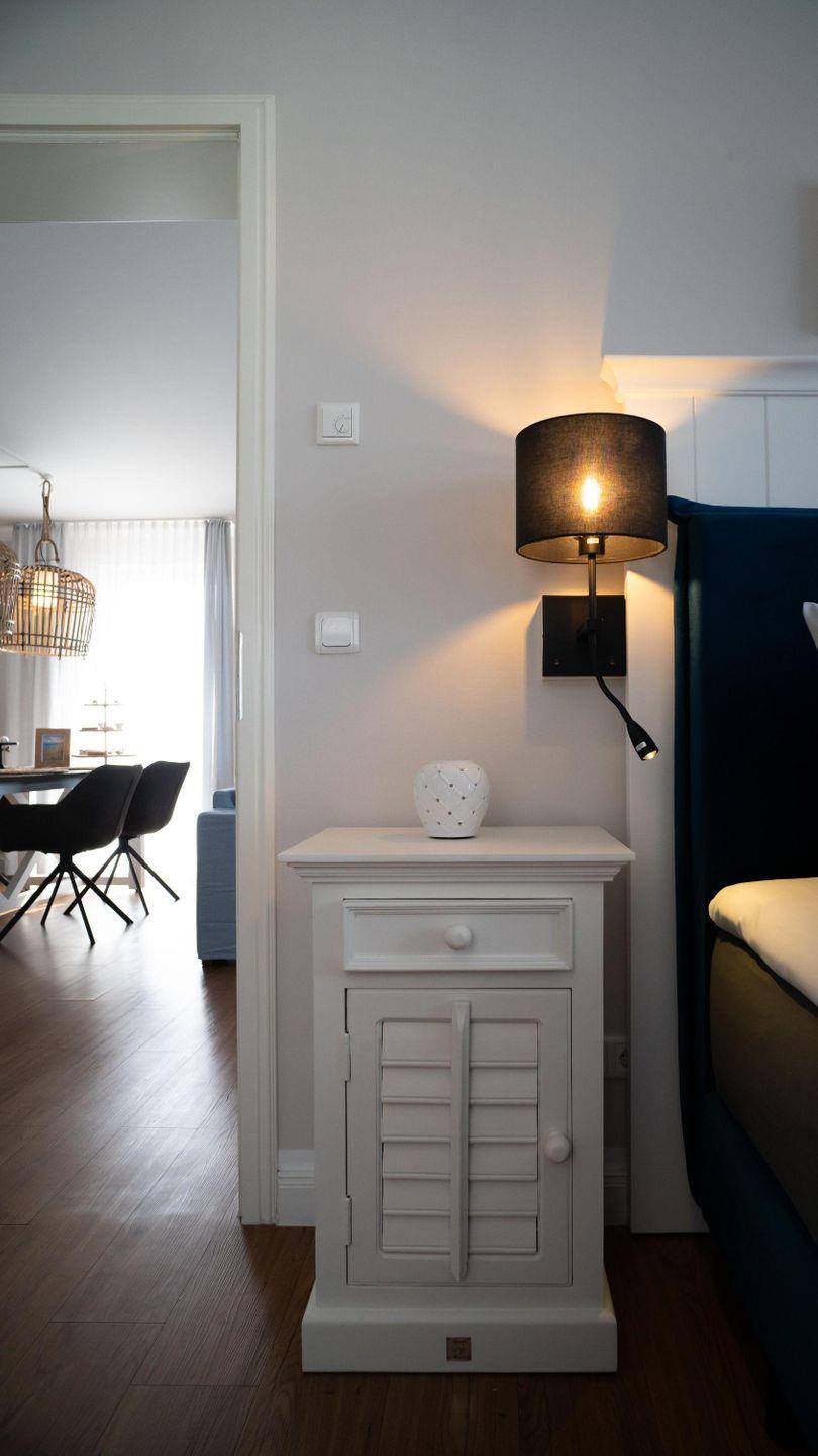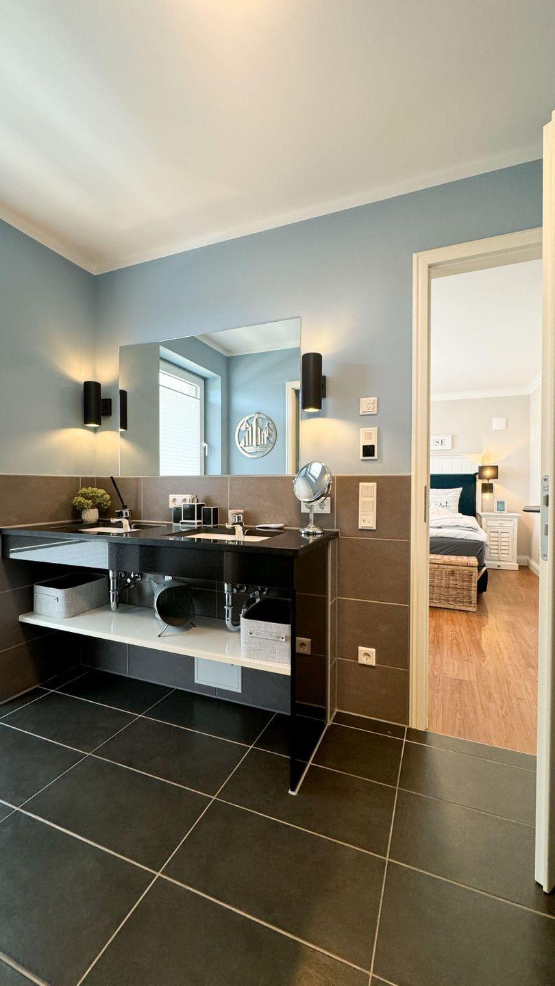 Die SCHLAFZIMMER verfügen über gemütliche Doppelbetten (180 x 200 cm /durchgehende Matratze) und geräumige Kleiderschränke. Ein separater ABSTELLRAUM bietet Stauraum für Ihre Urlaubskleidung. In einem der Schlafzimmer erwartet Sie zudem ein weiterer Flatscreen-TV. Die Ferienwohnung besticht mit einem WANNENBAD und einem DUSCHBAD mit bodengleicher Dusche. Ein Föhn und Handtuchtrockner ergänzen die Badausstattung. Auf der herrlichen DACHTERRASSE (Balkon) in Süd-Westausrichtung erwarten Sie ein traumhafter seitlicher Meerblick, ein Tisch sowie Stühle für gemeinsame Mahlzeiten an der frischen Luft. Eine SITZLOUNGE mit zwei Loungesesseln steht ebenfalls bereit. Nur 50 Meter vom Strand lässt es sich dort beim Geräusch der Wellen bestens entspannen. Eine Fußbodenheizung in allen Räumen sorgt für angenehme Wärme. Auch in den kalten Jahreszeiten.